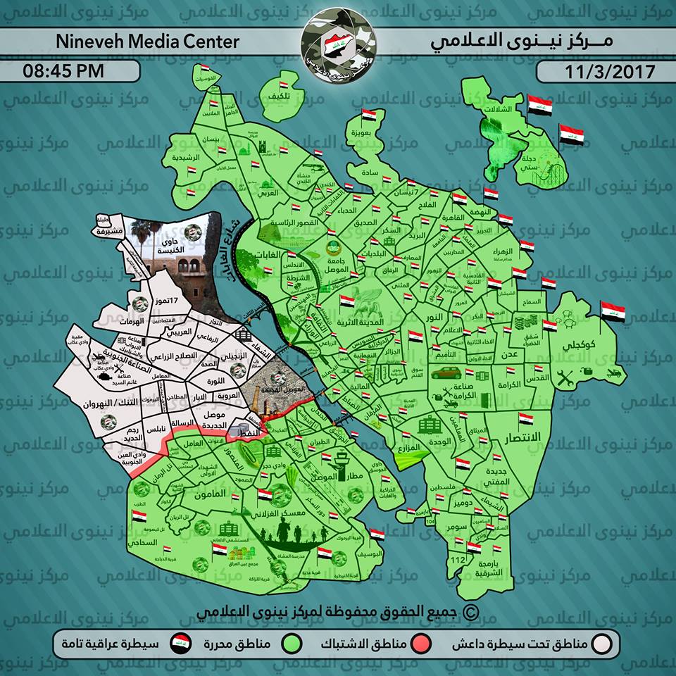 ئەم نەخشەیە لە لایەن ناوەندی راگەیاندنی نەینەوا بڵاوكراوەتەوە كە گەڕەكەكانی رزگاركراوی شارەكە و ھەروەھا نەخشەی شەڕ لە رۆژئاوای موسڵ و گەڕەكەكانی ژێر دەسەڵاتی داعش تا رۆژی 11 ئاداری 2017 پیشان دەدات.
