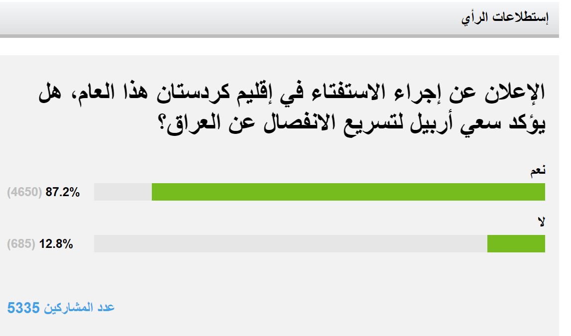 لهو چوارچێوهيهدا كهناڵى رووسياليهوم راپرسييهكى له ماڵپهڕهكهى داناوه و تێيدا پرسيارى ئهوهى كردووه، ئايا ئهنجامدانى راپرسى له ههرێمى كوردستان ههنگاوى ههولێر بۆ سهربهخۆيى و جيابوونهوه له عێراق خێراتر دهكات..