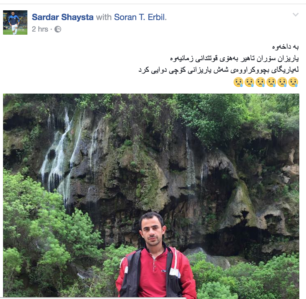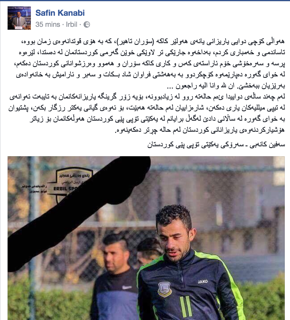 كۆچی دوایی سۆران تاهیری یاریزانی لاوی یانهی ههولێر له كاتی یاریكردنی له یاریگهیهكی بچووككراوهی ههولێر بووهته بابهتی گهرمی تۆڕی كۆمهڵایهتی فهیسبووك و ههمووان به ههواڵهكه خهمبارن.