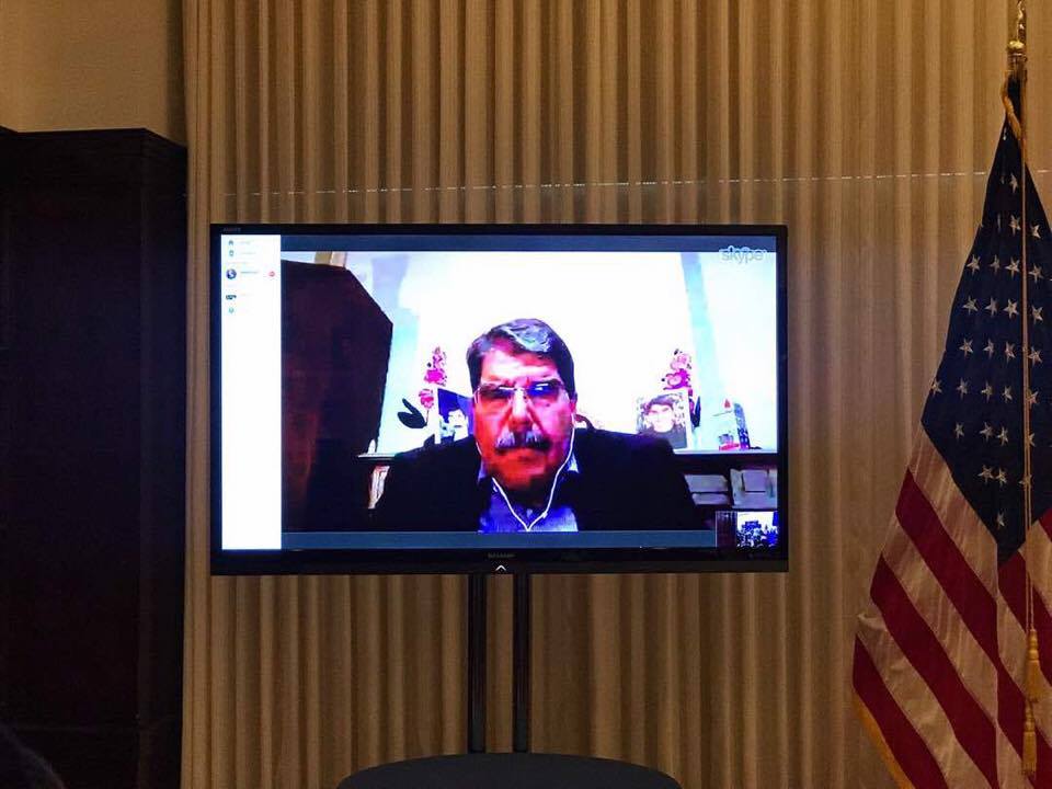 ساڵح موسلیم بە سکایب باسی لە ڕەوشی ئێستای ڕۆژئاوای کرد و ئاماژهی به هاوکارییەکانی ئەمریکا بۆ یەپەگە كرد و و دەستخۆشی لە ئیدارەی ئەمریکا کرد.