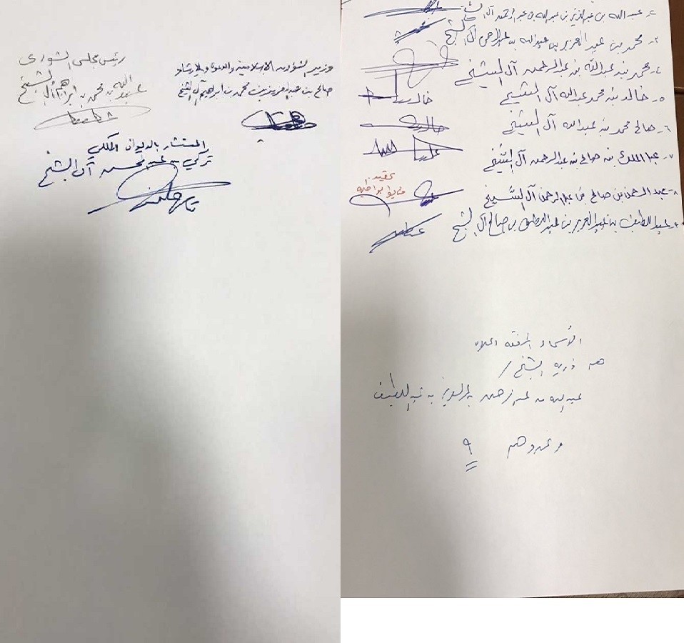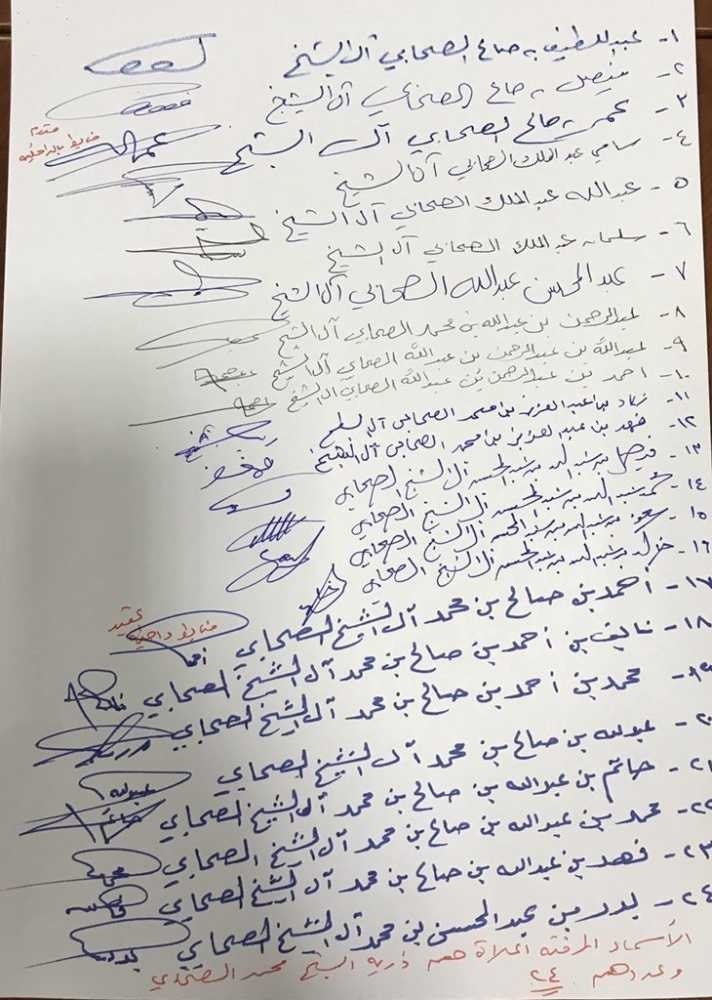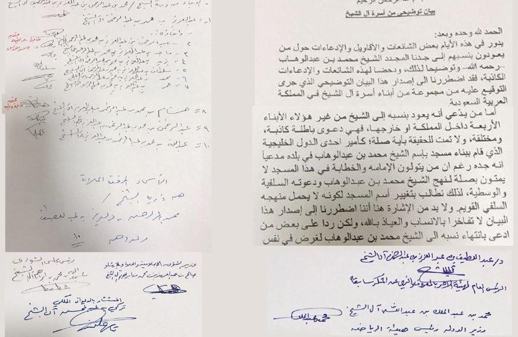 راگهيهندراوهكه 200 كهس واژووى كردووه، كه ديارهكهيان موفتى عهرهبستانى سعووديه و سهرۆكى شوورا و وهزيرى كاروبارى ئيسلامييه و ئهو كاربهدهست و گهوره كهسايهتييانهى بنهماڵهى دهسهڵاتدارى عهرهبستان پێداگرى لهسهر ئهوه دهكهن كه باپيرهى ميرى قهتهر محهممهد بن عهبدولوههاب نييه.