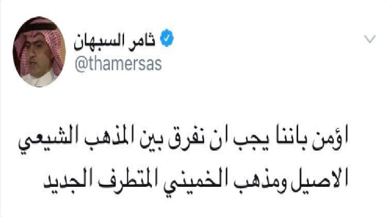 سامر سه‌بهان باڵیۆزی پێشووی سعوودیه‌ له‌ عێراق و وه‌زیری ده‌وڵه‌ت بۆ كاروباری كه‌نداو، له‌ تویته‌ره‌وه‌ نووسیوویه‌تی "باوه‌ڕم به‌وه‌ هه‌یه‌ ده‌بێت ئێمه‌ جیاوازی له‌ نێوان مه‌زهه‌بی ره‌سه‌نی شیعه‌ و مه‌زهه‌بی نوێی خومه‌ینی توندڕه‌ودا بكه‌ین"، به‌ڵام به‌ گوێره‌ی تویتیكی دیكه‌ی حه‌نان فه‌تلاوی سه‌رۆكی بزووتنه‌وه‌ی ئیراده‌، كه‌ وێنه‌یه‌كی له‌ تویته‌كه‌ی سه‌بهان گرتووه‌ ده‌ڵێت "سه‌بهان تویته‌كه‌ی تویته‌ری زۆر به‌ خێرایی سڕیوه‌ته‌وه‌.