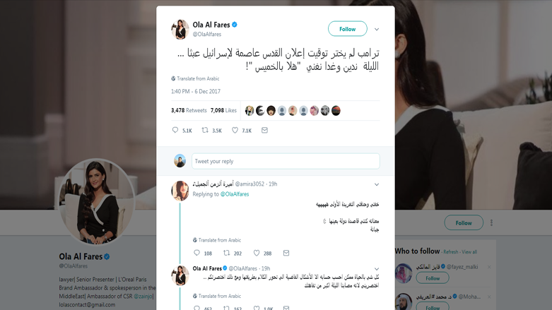 دوای نووسینی تویتێك له تۆڕی كۆمهڵایهتی تویتهر لهلایهن عولا فارسهوه، كه تێیدا گوتبووی "ترهمپ لهخۆیهوه كاتی راگهیاندنی ئۆرشهلیمی وهك پایتهختی ئیسرائیل ههڵنهبژاردووه، بهڵكو دوای سهردانهكهی بۆ ئێمه لهوه دڵنیا بووهوه كه عهرهب ئهمشهو سهركۆنهی دهكهن، سبهی گۆرانی دهڵێن و پێنجشهممهش پێشوازی لێ دهكهن"، گروپی "MBC" بڕیاری سڕكردنی ئهو پێشكهشكاره ئوردنیهی لهكارهكهیدا، بهوهی كه فارس بهو نووسینهی سعودیهی نیگهران كردووه، چونكه مهبهست له قسهكانی فارس ئهوه بوو، دوای سهردانهكهی ترهمپ بۆ ریاز ترهمپ بڕیاریداوه وهك پایتهختی ئیسرائیل دان به ئۆرشهلیمدا بنێت.