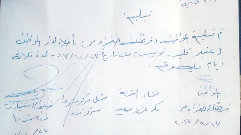 به گوێرهی بهڵگهنامهیهكیش كه دهست كوردستان 24 كهوتووه، بهڵێننامهیهك به هاووڵاتییانی كورد پڕدهكهنهوه، بۆ ئهوهی له ماوهی سێ رۆژدا ماڵهكانییان جێبهێڵن، ئهو خانووانهشی كه له دوای خیانهتی 16ی ئۆكتۆبهرهوه چۆڵ بوونه و دانیشتووانهكهی ئاوارهبوونه، راستهوخۆ عهرهبه هاوردهكان، لهناویدا نیشتهجێ دهبن.