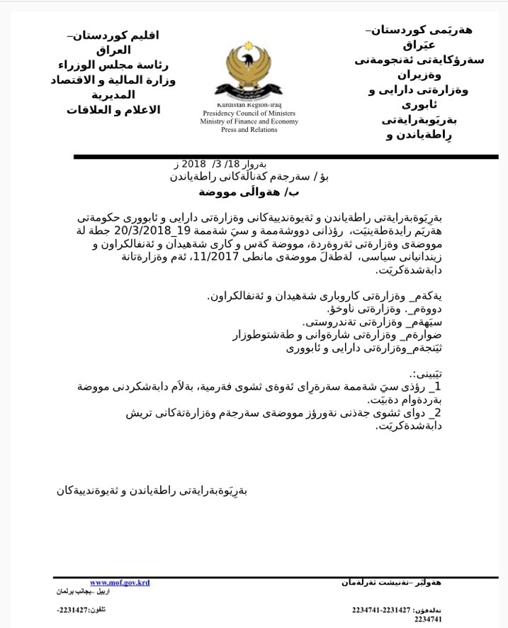 به گوێرهى زانيارييهكان، بڕياره مووچهى ههريهك له وهزارهتى كاروبارى شههيد و ئهنفالكراوان و وهزارهتى دارايى و ناوخۆ و شارهوانى دابهش بكرێت.
