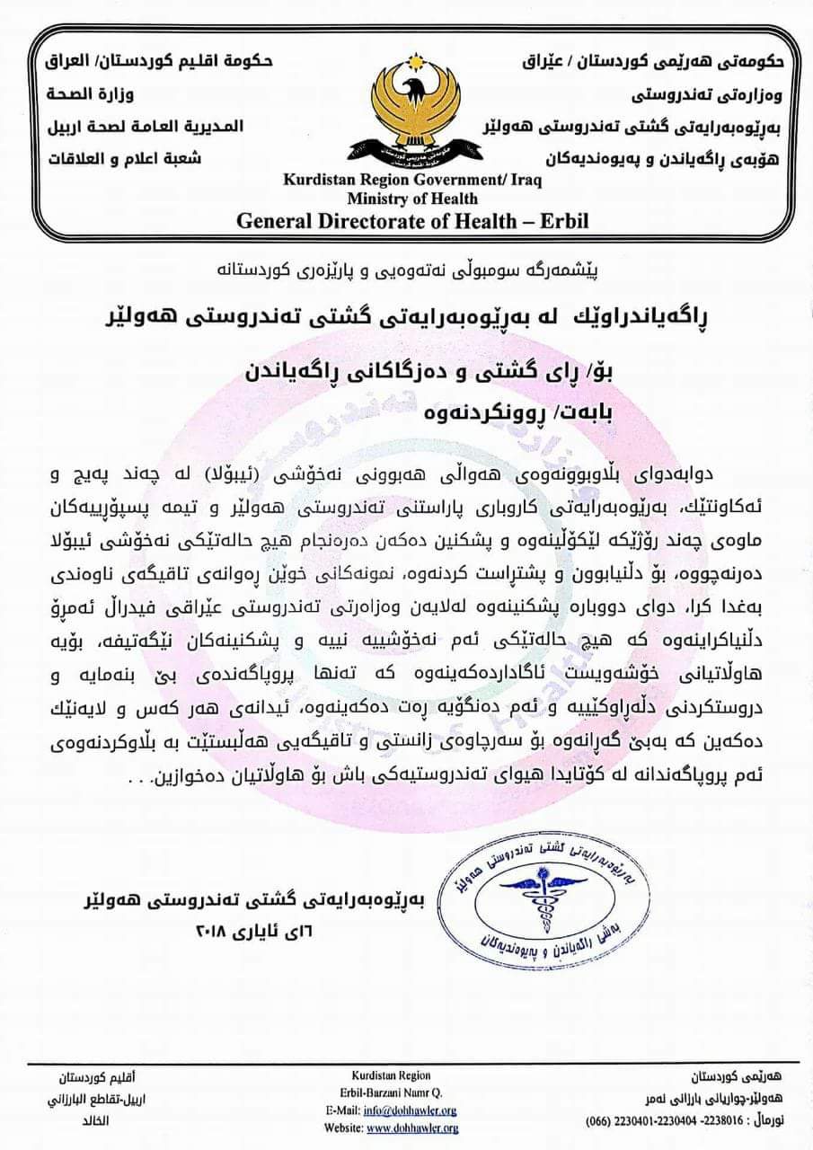 ڕاگه‌یاندراوێك ‌ له‌ به‌ڕێوه‌به‌رایه‌تی گشتی ته‌ندروستی هه‌ولێر‌