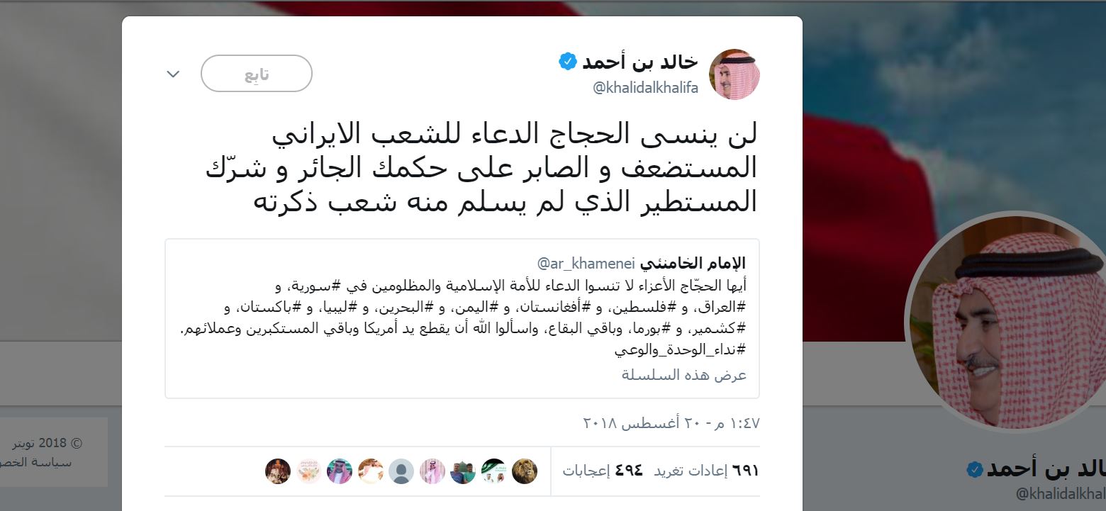 ئهم قسانهى وهزيره بهحرهينييهكه دواى ئهوه هات، خامهنهئى پهيامێكى ئاراستهى حاجيان كردووه و تێيدا داواى لێكردوون، نزا بكهن بۆ ئوممهتى ئيسلامى و ستهملێكراوان له سووريا، عێراق، فهلهستين، ئهفغانستان، يهمهن، بهحرهين، ليبيا، پاكستان، كشمير، بۆرما و ناوچهكانى ديكهى جيهان.