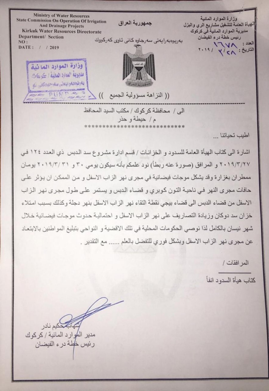 له‌ به‌شێكی دیكه‌ی راگه‌یه‌ندراوه‌كه‌دا باسی ئه‌وه‌ كراوه‌، "به‌هۆی پڕبوونی به‌نداوی دووكان و سه‌ڕڕێژبوونی ئاو له‌ به‌نداوه‌كه‌، پێشبینی ده‌كرێت، به‌ درێژایی مانگی نیسان مه‌ترسی روودانی لافاو به‌رده‌وام بێت، بۆیه‌ داوا له‌ ئیداره‌ی ئه‌و قه‌زا و ناحیانه‌ ده‌كه‌ین، هاووڵاتیان له‌ مه‌ترسییه‌كان ئاگادار بكه‌نه‌وه‌ و ده‌ستبه‌جێ كه‌ناری زێی بچووك چۆڵ بكه‌ن".