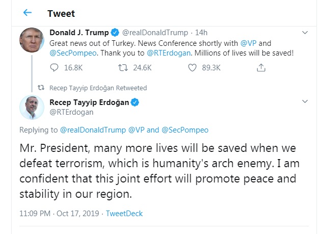 لە دوای راگەیاندنی رێککەوتنی جێگری سەرۆکی ئەمەریکا و سەرۆکی تورکیا، ترەمپ لە تویتێکدا نووسیویەتی، هەواڵێکی خۆش لە تورکیاوە. سوپاس رەجەب تەیب ئەردۆغان، ژیانی ملیۆنەها کەس رزگار دەکرێت.