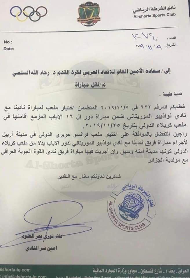 یانهی شوڕتهی بهغدا داوا له فیدراسیۆنی تۆپی پێی عهرهب دهكات یاری گهڕانهوهیان دژی نهوازیبووی مۆریتانی بۆ ههولێر بگوازنهوه.
