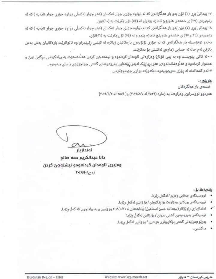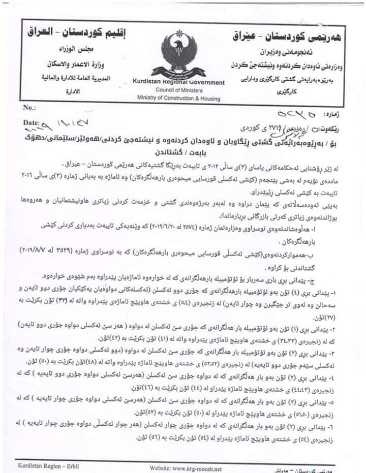 بەپێی بڕیارەکە کە ئیمزای ئەندازیار دانا عەبدولکەریم حەمەساڵح، وەزیری ئاوەدانکردنەوە و نیشتەجێکردنی لەسەرە، بڕیاردراوە بە دووبارە داڕشتنەوە و هەمواکردنەوەی کێشی ئەکسلی رێپێدراو و هاوکات هەڵوەشاندنەوەی نووسراوی پێشووی وەزارەت ژمارە (2574 لە 20/6/2019) تایبەت بە دیاریکردنی کێشی بارهەڵگرەکان.