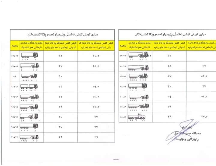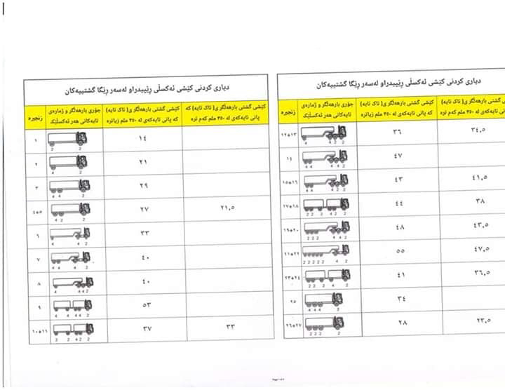 وەزارەتی ئاوەدانکردنەوە بڕیاریداوە بە پێدانی بڕی باری سەربار بۆ ئۆتۆمبێلی بارههڵگر، كه له چوارچێوهی خشتهی تایبهتهوه رێكخراون. هاوکات ئاماژە بەوە کراوە، لەکاتی پێویست و بەپێی قۆناغ وەزارەتی ئاوەدانکردنەوە و نیشتەجێکردن هەڵدەستێت بە زیادکردنی بڕگەی نوێ و هەموارکردنەوە و هەڵوەشاندنەوەی هەر بڕیارێك لەبەر رۆشنایی گشتی چوارچێوەی یاسا.