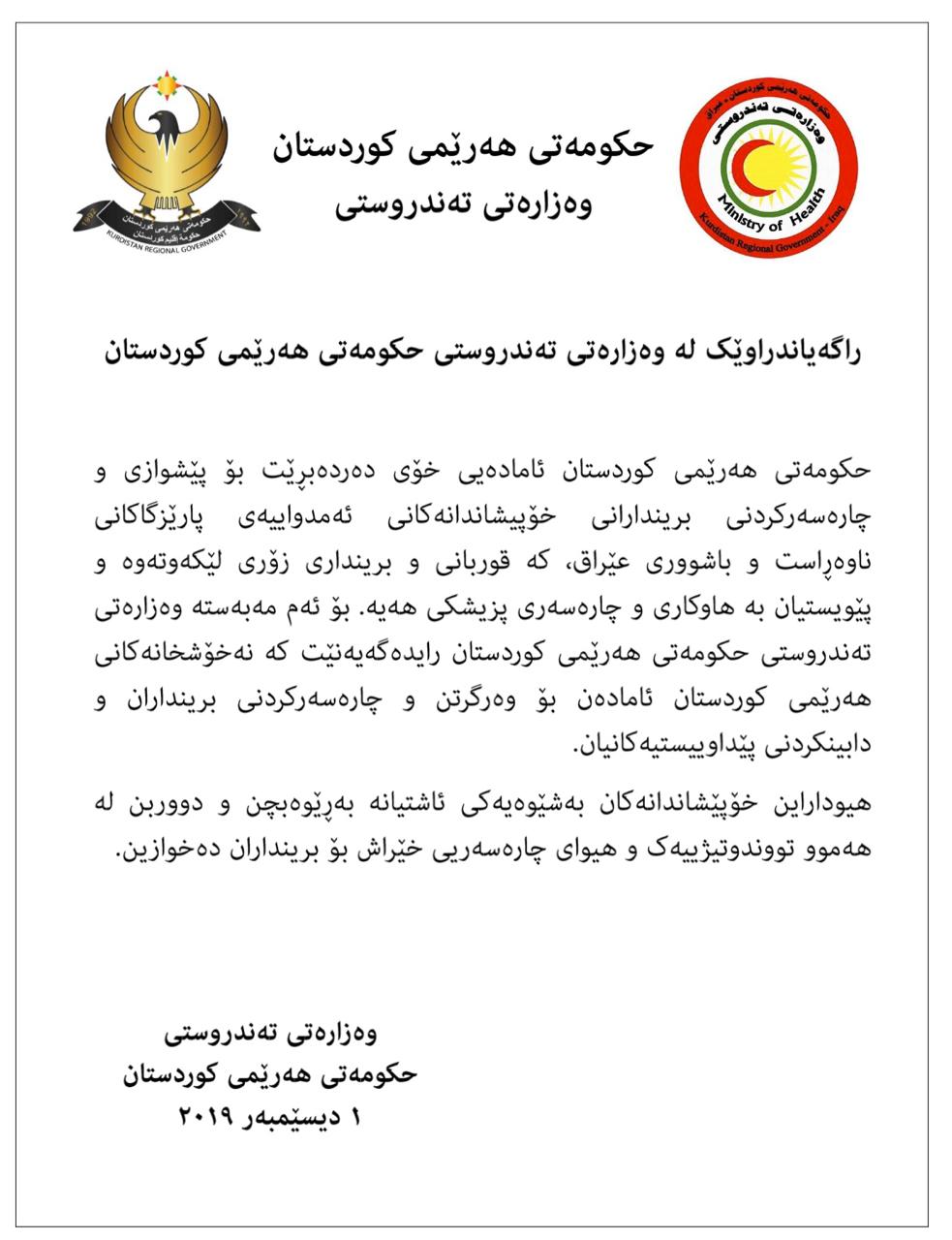 راگەیاندراوێك لە وەزارەتی تەندروستی حکوومەتی هەرێمی کوردستانه‌وه‌