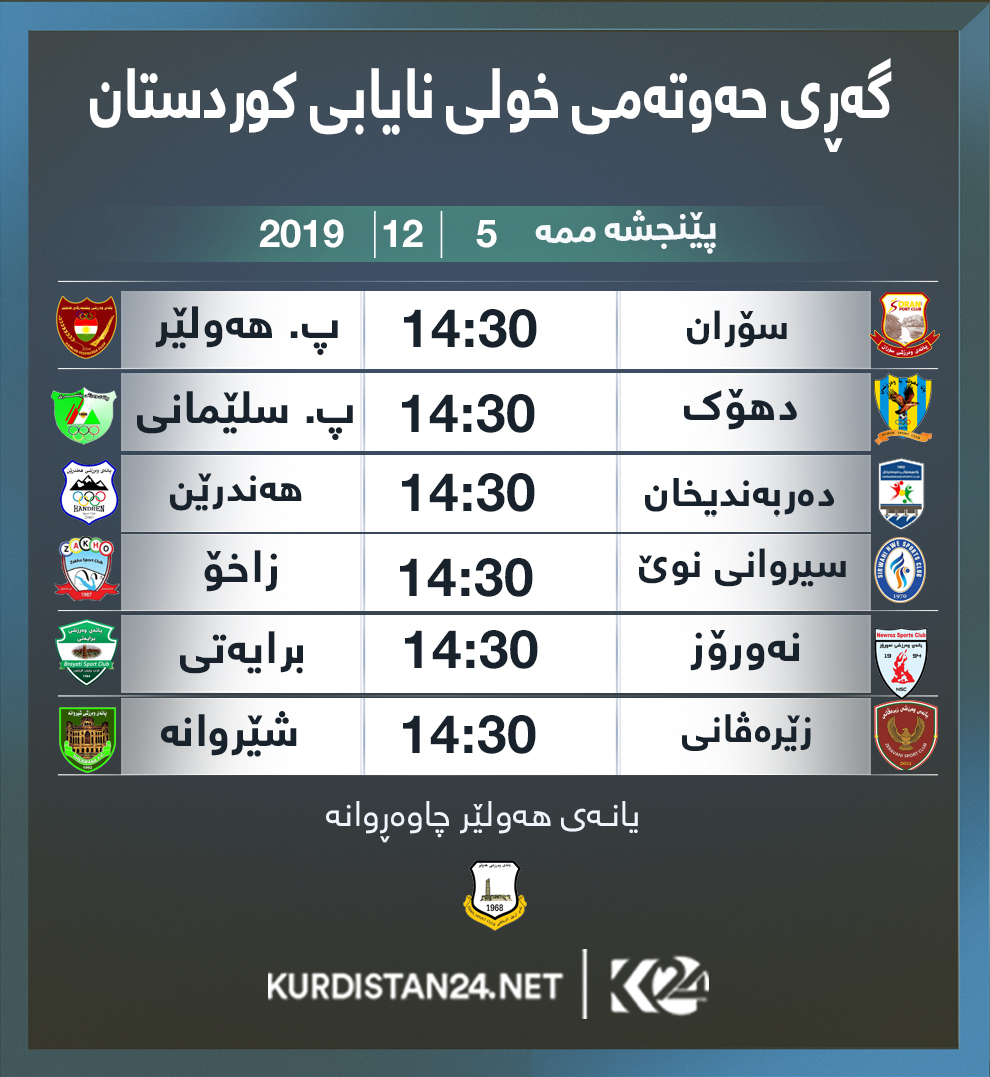 ئێواره‌ی سبه‌ی پێنجشه‌ممه‌ گه‌ڕی حه‌وته‌می خولی نایابی كوردستان به‌ ئه‌نجامدانی 6 یاری له‌ كاتژمێر 02:30 ده‌ستپێده‌كات، له‌م هه‌فته‌یه‌دا یانه‌ی هه‌ولێر پشووه‌، پێشمه‌رگه‌ی هه‌ولێر له‌ ره‌واندوز ده‌بێته‌ میوانی سۆران، نه‌ورۆزیش له‌ ئه‌ركێكی سه‌ختدا رووبه‌ڕووی برایه‌تی پێشه‌نگ ده‌بێته‌وه‌، دهۆكیش دوای هه‌فته‌یه‌ك پشوو، بۆ پێشمه‌رگه‌ی سلێمانی ساز و ئاماده‌یه‌، زێره‌ڤانیش ده‌یه‌وێت بارودۆخه‌ خراپه‌كه‌ی شێروانه بقۆزێته‌وه‌ و به‌ شكسته‌وه‌ ڕه‌وانه‌ی گه‌رمیان بكاته‌وه‌، یانه‌ی زاخۆش بۆ رووبه‌ڕبوونه‌وه‌ی سیروانی نوێ سه‌ردانی سلێمانی كردووه‌، ده‌ربه‌ندیخان له‌ نێو یاریگه‌ پڕهانده‌ره‌كه‌ی باوه‌ش بۆ هه‌ندرێن ده‌كاته‌وه‌.