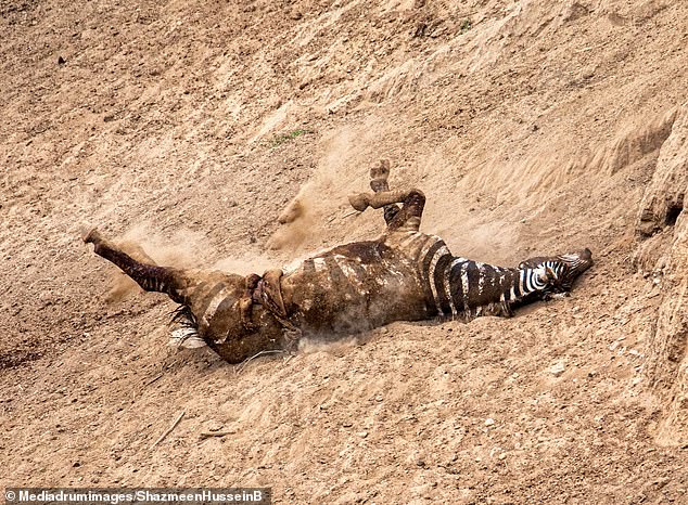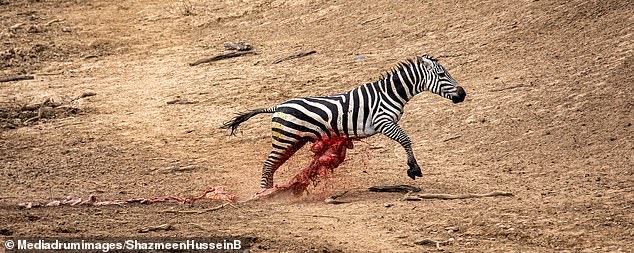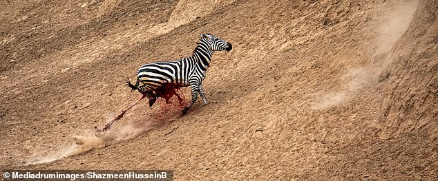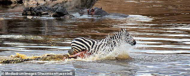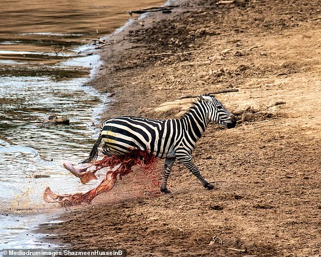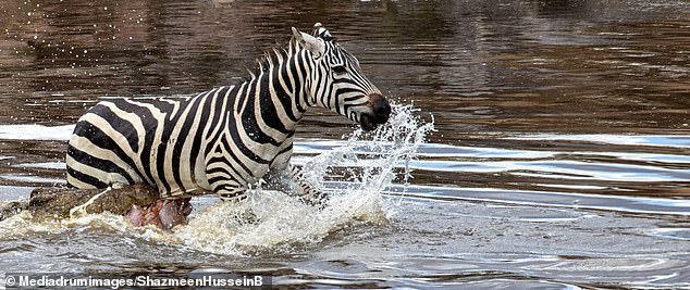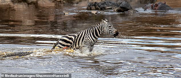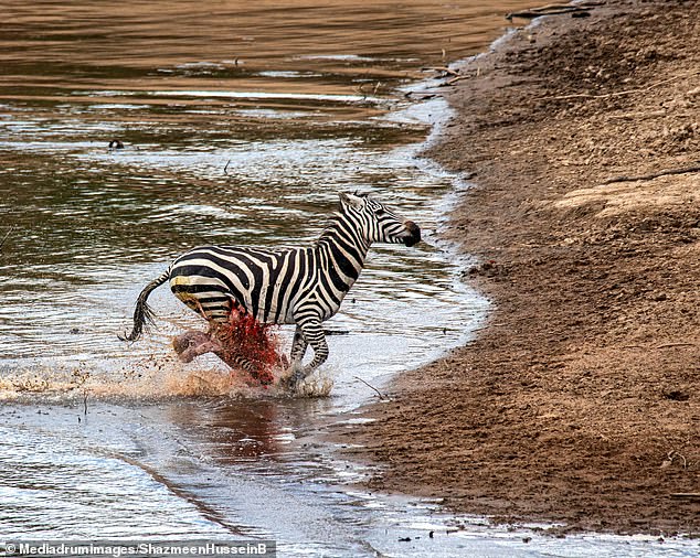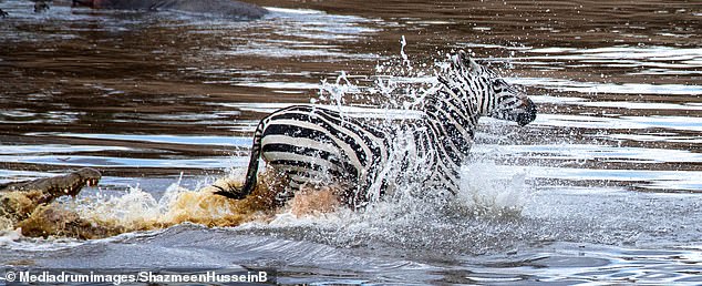 فۆتۆگرافەرێک بە ناوی شازەمین حوسەین، بە کامێراکەی ساتەوەختی راوکردنی زێبرایەک (کەرە کێوی) لە کینیا لە لایەن تیمساحێکەوە تۆمار دەکات.