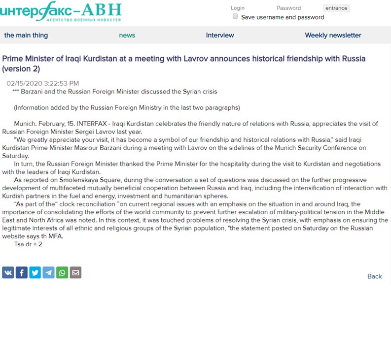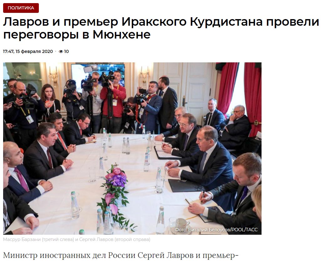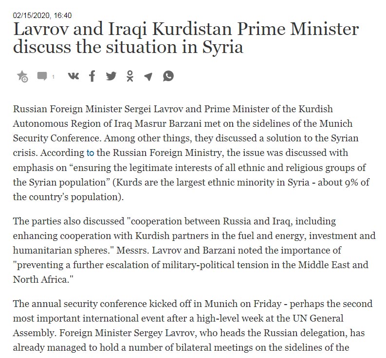 لهدرێژهی بابهتهكهدا هاتووه: "وهزیری كارووباری دهرهوهی رووسیای فێدراڵ و سهرۆكی حكومهتی ههرێمی كوردستان له میانهی بهڕێوهچوونی كۆنفرانسی ئاسایشی میونشن كۆبوونهوه و ههردوولا تاووتوێی رهوشی سوریا و هێوركردنهوهی قهیرانی سووریا و پاراستنی ماف و داخوازییهكانی سهرجهم پێكهاتهكانی سوریایان كرد".