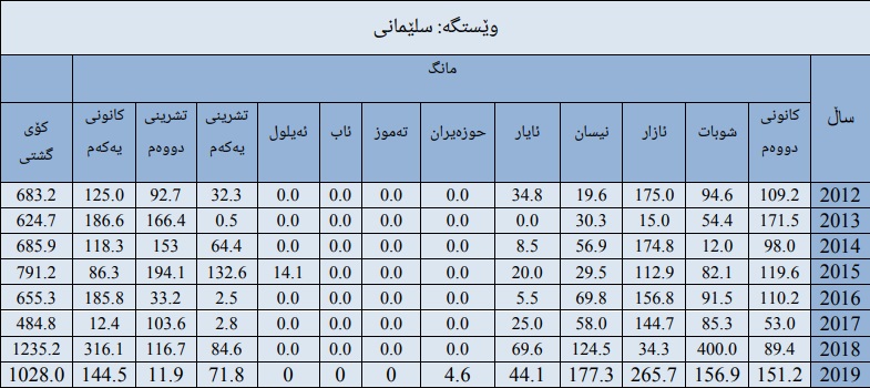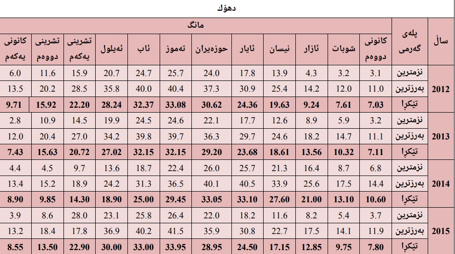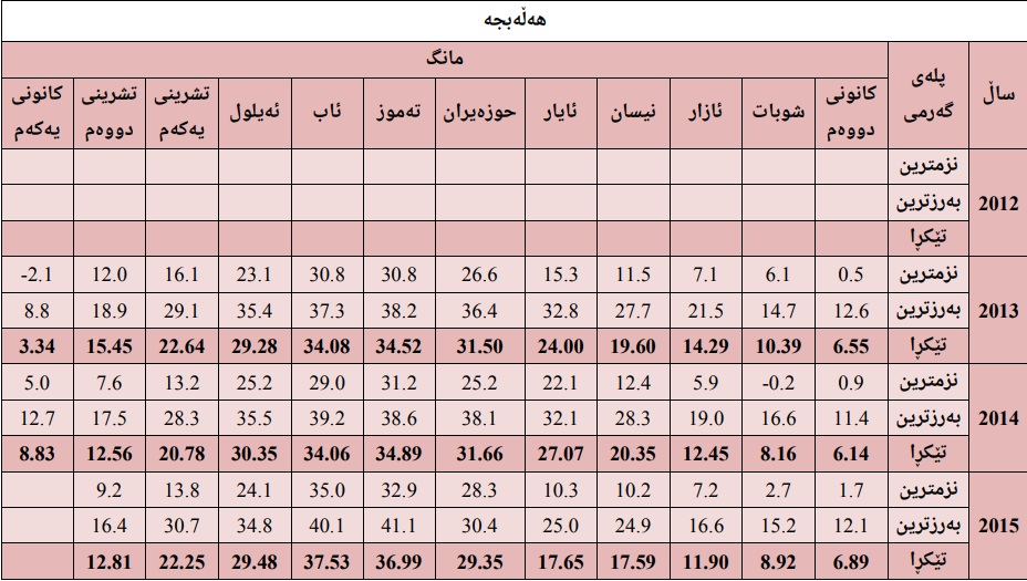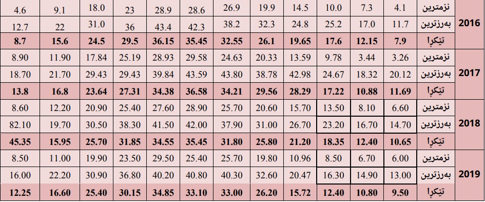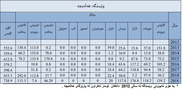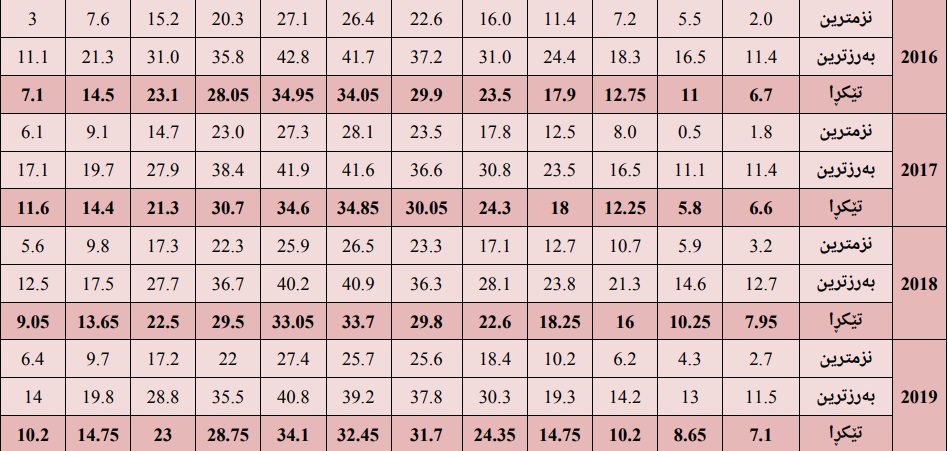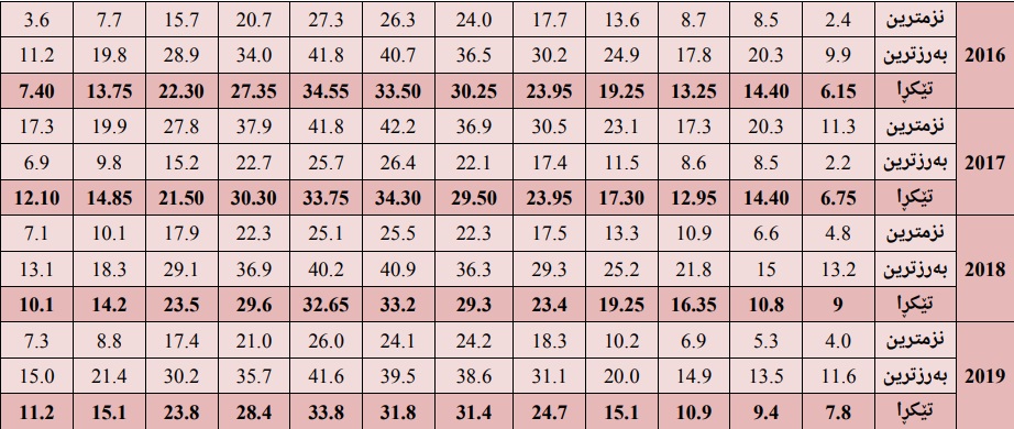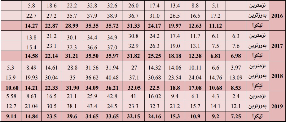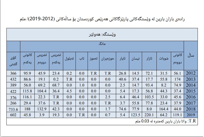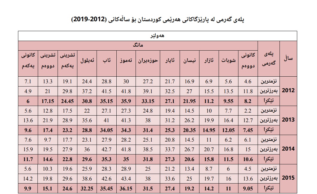 دەستەی ئاماری هەرێمی کوردستان رێژەی بارانبارین و ئاستی پلەی گەرمیی لە ساڵی 2012ـەوە تا ساڵی 2019 بڵاوکردەوە.