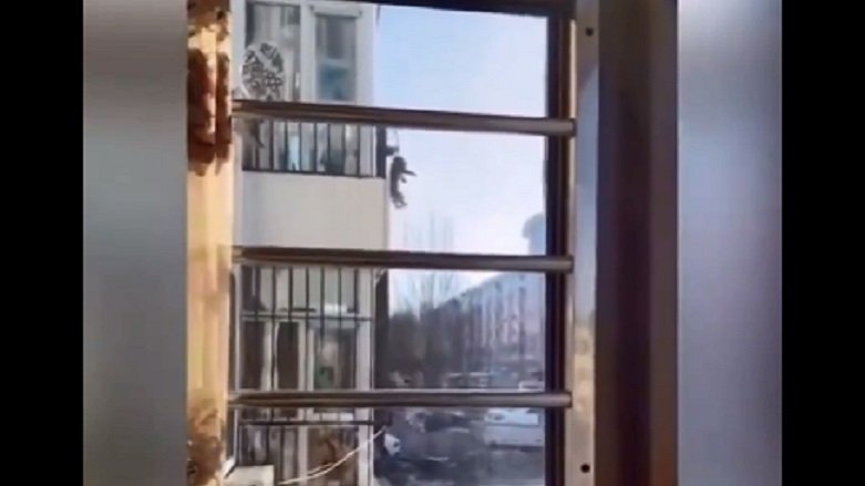 A pet owner in China is captured on camera by a neighbor dangling a dog down from a balcony (appears to be 3 floors up) and reeling the dog back up after the dog is done w/ his business.