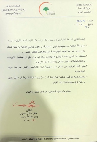 له‌ به‌یاننامه‌یه‌كدا وه‌زاره‌تی ته‌ندروستی عێراق داوای له‌ حكومه‌تی به‌غدا كردووه‌، شانه‌ی قه‌یرانه‌كانی وه‌زاره‌ت به‌ باشی ده‌زانێت ته‌واوی رێگاكانی گه‌شتكردن و زیاره‌تكردن له‌ نێوان عێراق و ئێران دابخات، ته‌نیا شانده‌ دیپلۆماسییه‌كان نه‌بێت، ئه‌ویش به‌و مه‌رجه‌ی پشكنینی پزیشكیان بۆ بكرێت و له‌ ئه‌نجامی پشكنینه‌كان دڵنیا ببنه‌وه‌.
