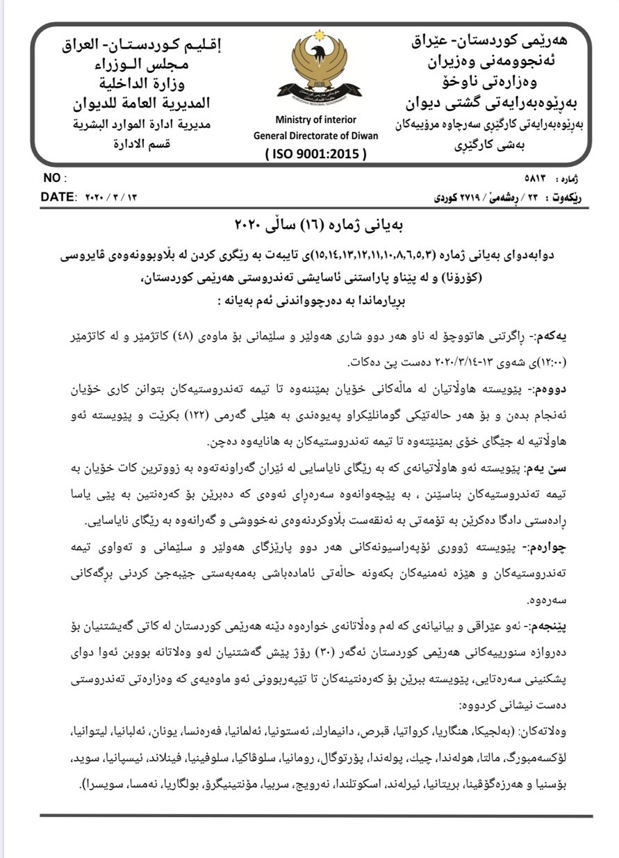 بەگوێرەی راگەیەندراوێکی وەزارەتی ناوخۆ، لە کاتژمێر 12ـی ئەمشەوەوە، بۆ ماوەی 48 کاتژمێر، هاتووچۆی ناوشار لە هەولێر و سلێمانی رادەگیرێت.