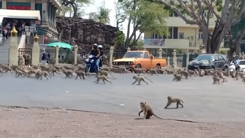 گرتە ڤیدیۆیەک لە هەرێمی لۆپبوری لە تایلەند بڵاوکراوەتەوە، دوو کۆمەڵە مەیموون کە دژی یەکترن، شاڵاو دەبنە بەر پاشماوەی خواردنەکان و لەسەر مۆزێک دەبێتە شەڕیان.