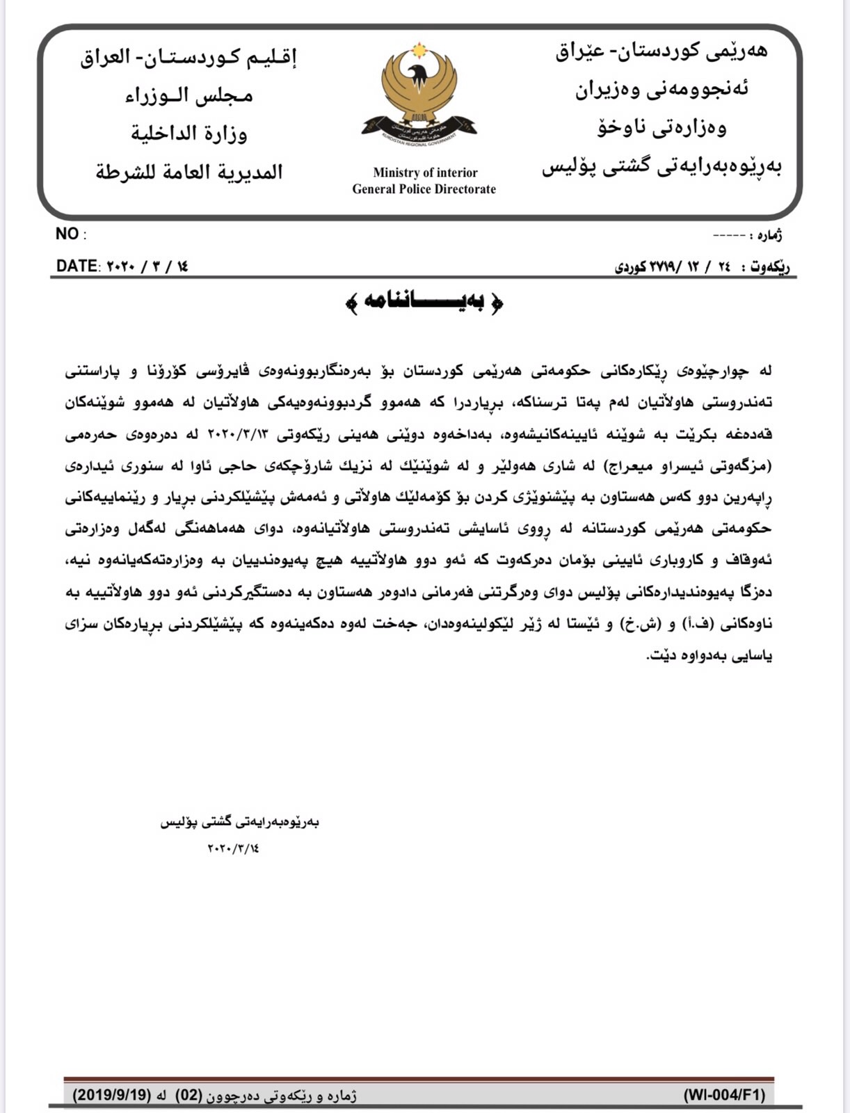 راگەیەندراوێك لە بەڕێوەبەرایەتی گشتی پۆلیسەوە