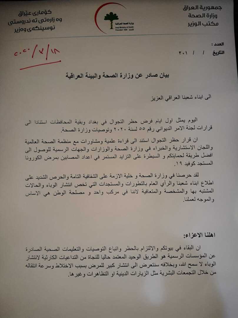 وەزارەتی تەندروستی عێراق لە یەكەم رۆژی قەدەغەی هاتوچۆ لە بەغدا و پارێزگاكانی دیكە، پەیامێكی ئاراستەی هاووڵاتیانی دەكات و جەخت دەكاتەوە، "مانەوە لە ماڵەوە تاكە رێگەیە بۆ رزگاربوون لە مەترسییەكانی بڵاوبوونەوەی كۆرۆنا".