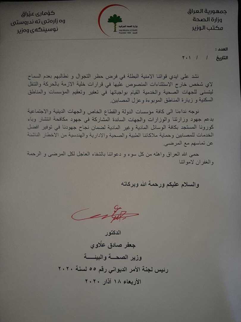 حەعفەر سادق عەللاوی لە پەیامەكەیدا روو لە هاووڵاتیانی عێراق دەڵێت: "بڕیاری قەدەغەی هاتوچۆ دەرەنجامی پرۆسەی تاوتوێكردنی پرسی بڵاوبوونەوەی كۆرۆنایە لەگەڵ رێكخراوی تەندروستی جیهانی و لیژنە راوێژكارییەكان و پسپۆۆڕانی وەزارەتی تەندروستی و لایەنە فەرمییەكان بۆ گەیشتن بە باشترین رێگە بۆ پارێزگاریكردن لە سەلامەتی ئێوە".