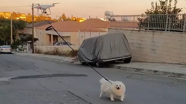 پیاوێک لە وڵاتی قوبڕس، بڕیار دەدات لە رێگای درۆون، فڕۆکەی بێ فڕۆکەوان، سەگەکەی ببات بۆ پیاسە، ئەمەش بەهۆی مەترسییەکانی تووشبوون بە ڤایرۆسی کۆرۆنا.
