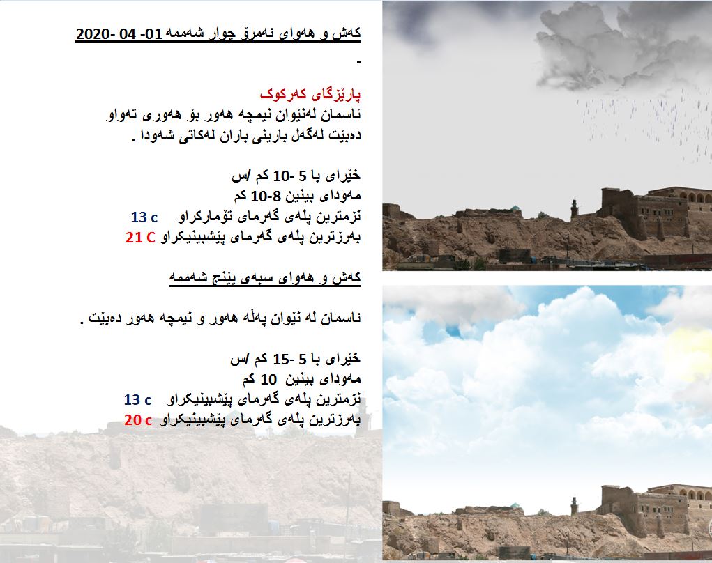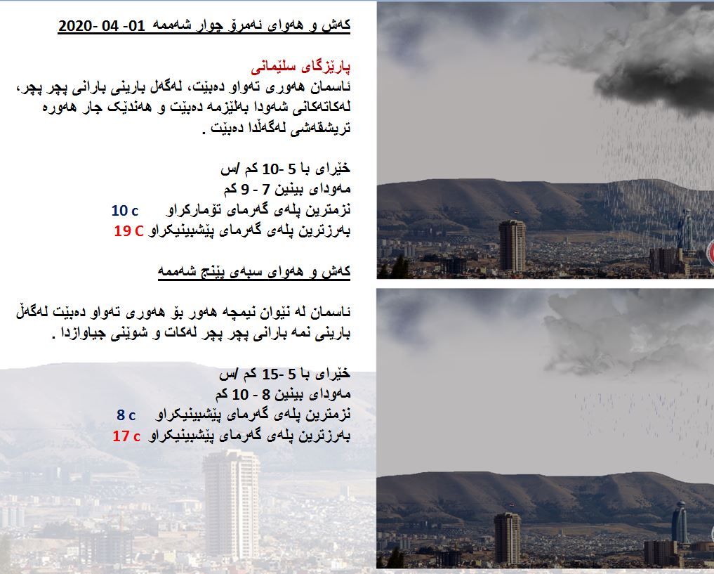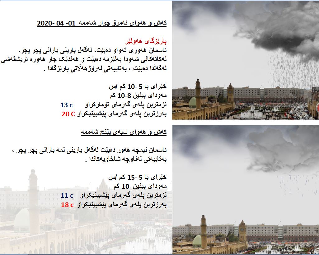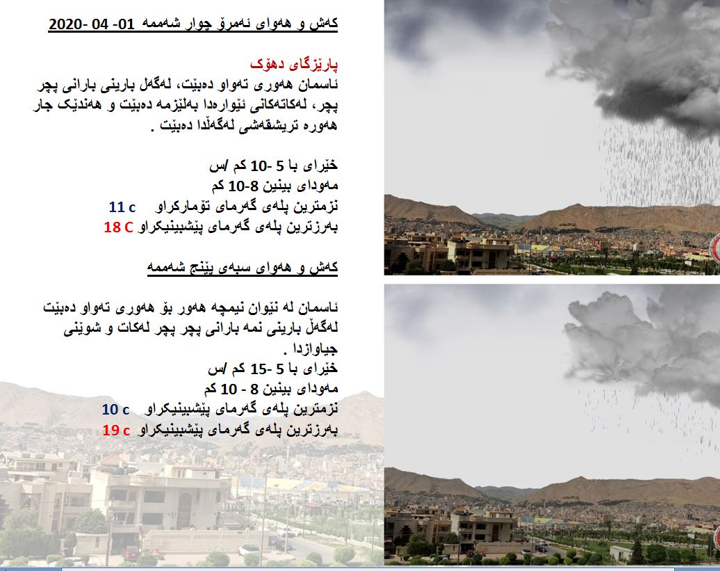 بەڕێوەبەرایەتی كەشناسی و بومەلەرزەزانی ھەرێمی كوردستان، پێشبینیەكانی بۆ كەشوھەوای 48 كاتژمێری داھاتوو راگەیاند، بەگوێرەی پێشبینیەكان ئەمڕۆ ئاسمانی ھەرێمی كوردستان، ھەوری تەواو دەبێت لەگەڵ بارانی پچڕ پچڕ لەكاتەكانی شەودا لە ھەندێك ناوچە بارانی بەلێزمە دەبێت ھەندێك جار ھەورەتریشقەی لەگەڵ دەبێت. بەرزترین پلەی گەرما لە ھەولێر 20  و سلێمانی 19 و دھۆك 18 پلە و لە كەركووك بەرزترین پلەی گەرما 21 پلەی سیلیزی دەبێت.