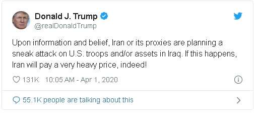 لە تویتێكدا لە هەژماری تایبەتی خۆی لە تۆڕی كۆمەڵایەتی تویتەر ترەمپ نووسیویەتی: "بەگوێرەی چەند زانیارییەك كە بە دەستمان گەیشتووە، ئێران و بریكارەكانی پلان بۆ ئەنجامدانی زنجیرەیەك هێرش بۆ سەر هێزەكانمان و بەرژەوەندییەكانمان لە عێراق دادەڕێژن".