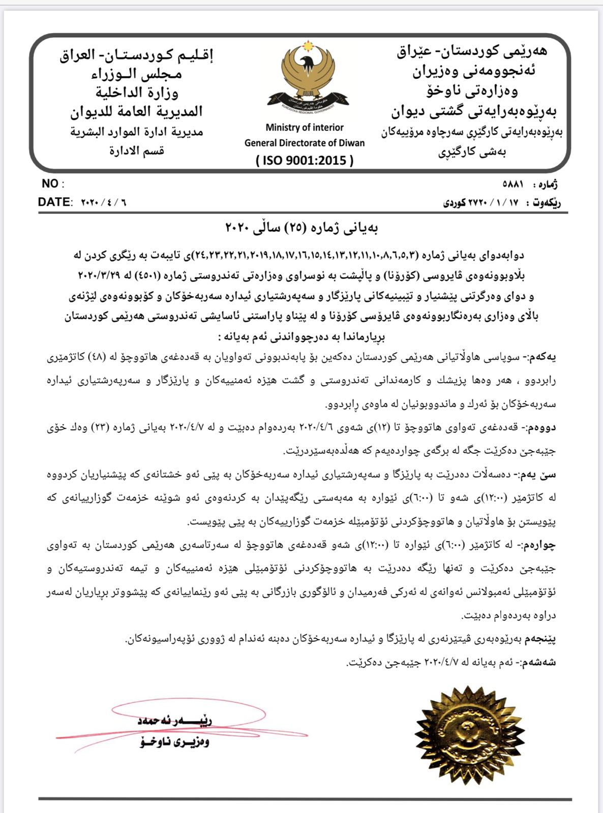 * سووپاسی هاووڵاتیانی كوردستان ده‌كه‌ین، ئێمه‌ سه‌ربه‌رزین به‌ پابه‌ندبوونی ئێوه‌ به‌ بڕیار و رێنماییه‌كان. سوپاس بۆ تیمه‌كانی ئۆپراسیۆن و پارێزگاره‌كان و تیمه‌كانی ته‌ندروستی.
