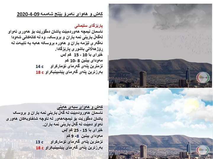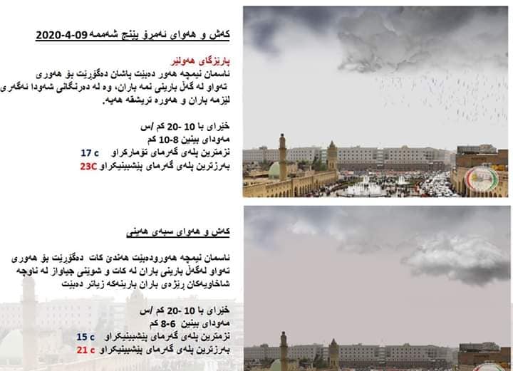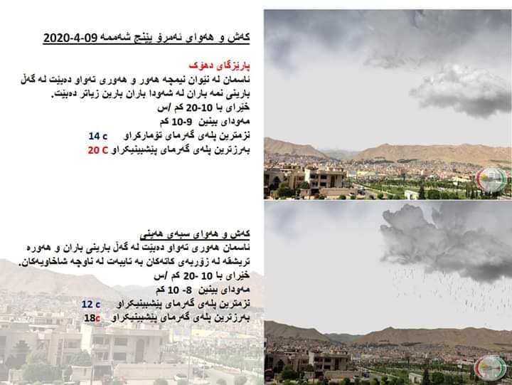 بەڕێوەبەرایەتی كەشناسی و بومەلەرزەزانی ھەرێمی كوردستان، پێشبینیەكانی بۆ كەشوھەوای 48 كاتژمێری داھاتوو راگەیاند، بەگوێرەی پێشبینیەكان ئەمڕۆ و سبەی، هەور و نمە بارانی پچڕ پچڕ دەبێت.
