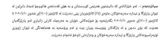 وەزارەتی ناوخۆ قەدەغەی هاتووچۆی تا 16/04/2020 درێژکردەوە و داواش دەکات هاووڵاتیان پێوەی پابەند بن، دەنا بەگوێرەی یاسا سزا دەدرێن.