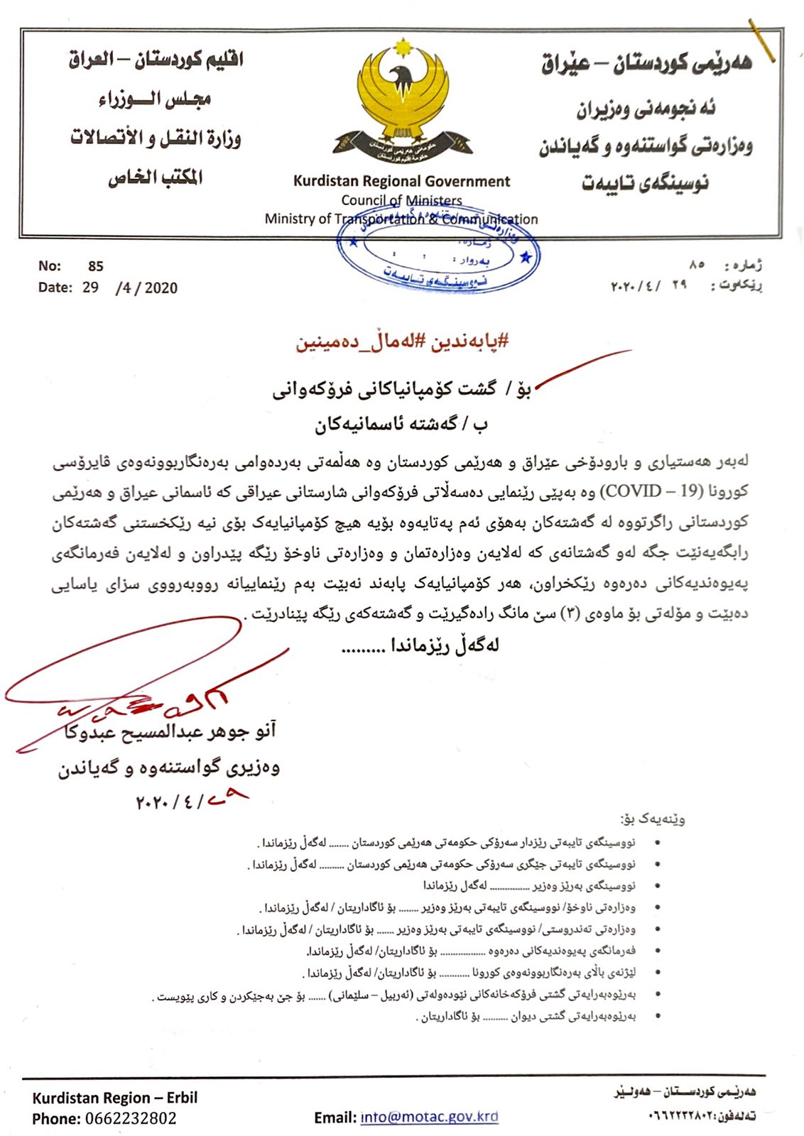 وەزارەتی گواستنەوەی و گەیاندنی حکومەتی هەرێمی کوردستان بڵاویکردەوە، هیچ کۆمپانیایەک بۆی نییە رێکخستنی گەشتەکان رابگەیەنێت جگە لەو گەشتانەی وەزارەتی ناوخۆ رێگەیان پێدەدات.