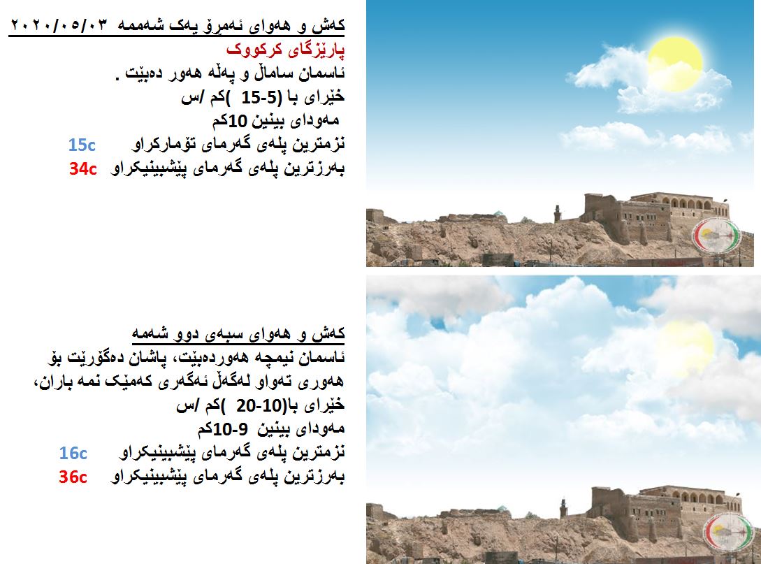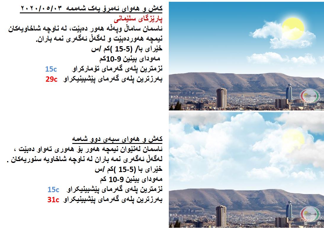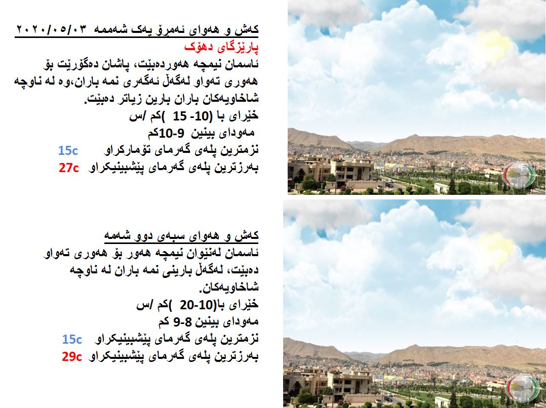 لەبارەی كەشوھەوای سبەی كەشناسی پێشبینی دەكات، رۆژی دووشەممە ئاسمانی ھەرێمی كوردستان لەنێوان نیمچە ھەور و ھەوری تەواودا دەبێت و لە ھەندێك ناوچەی شاخاوی ئەگەری نمە باران ھەیە.