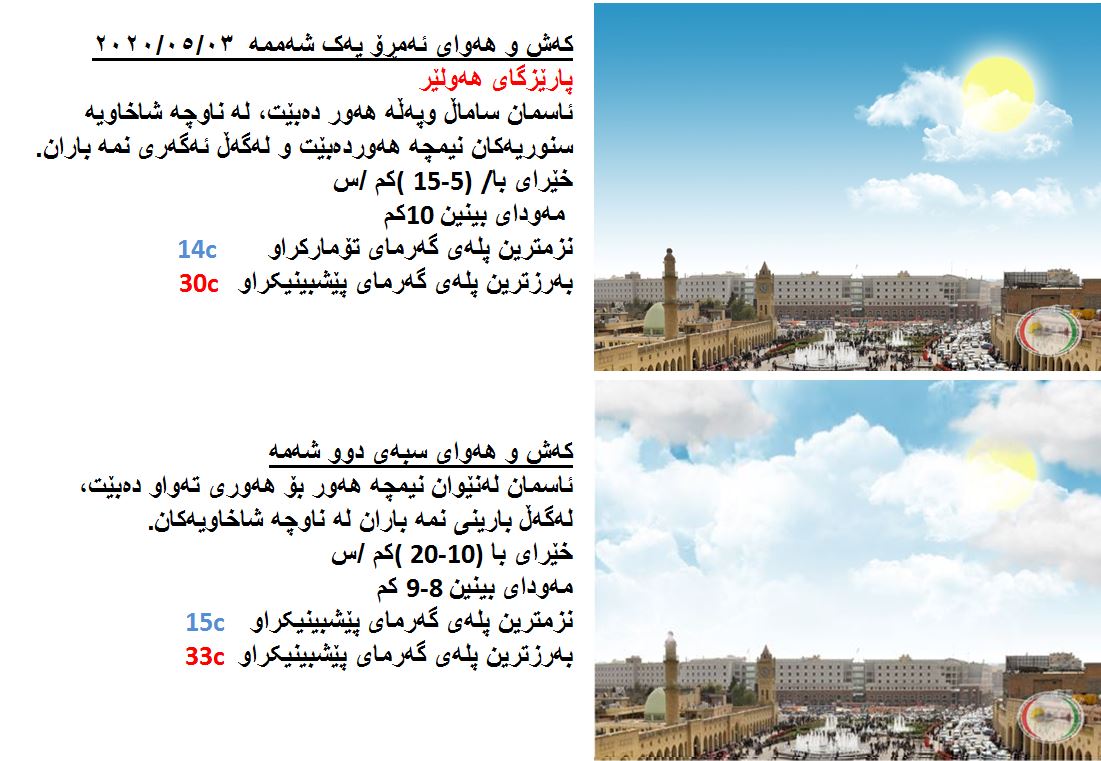 بەڕێوەبەرایەتی كەشناسی و بومەلەرزەزانی ھەرێمی كوردستان، پێشبینیەكانی بۆ كەشوھەوای 48 كاتژمێری داھاتوو راگەیاند، بەگوێرەی پێشبینیەكان ئەمڕۆ ئاسمانی ھەرێمی كوردستان ساماڵ و پەڵە ھەور دەبێت، لە ناوچە شاخاوییە سنوورییەكان نیمچە ھەور دەبێت و ئەگەری بارینی نمە باران ھەیە. بەرزترین پلەی گەرما لە ھەولێر 24 و سلێمانی 22 و دھۆك 21 لە كەركووك بەرزترین پلەی گەرما 27 پلەی سیلیزی دەبێت.