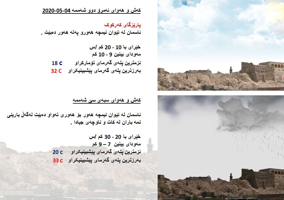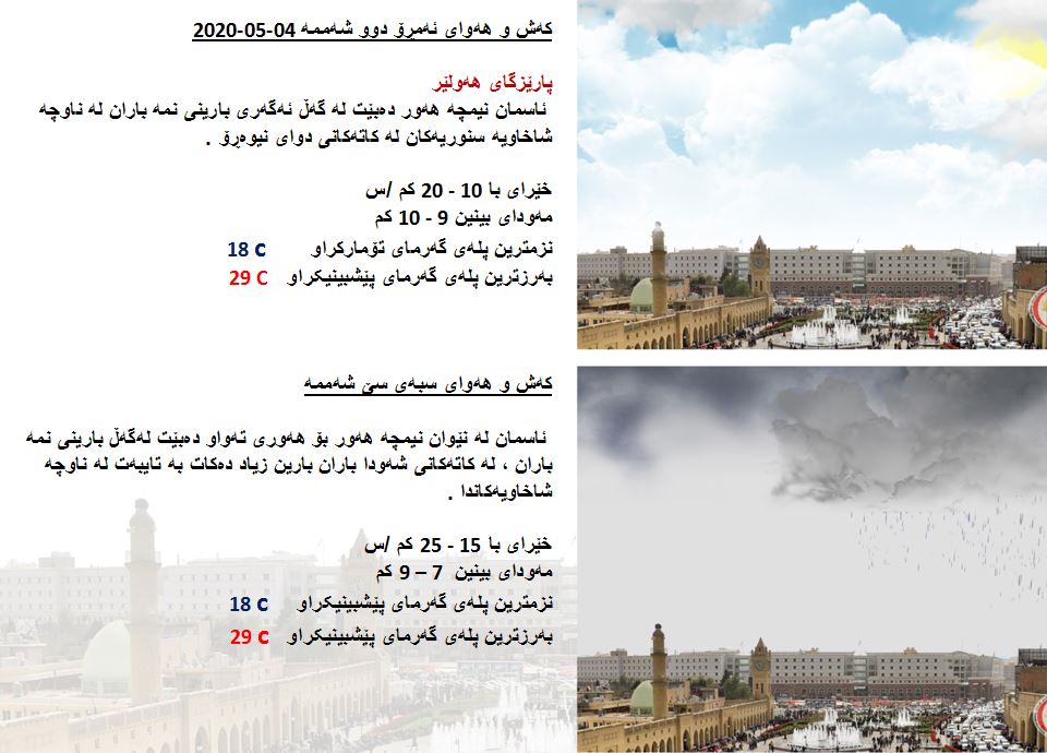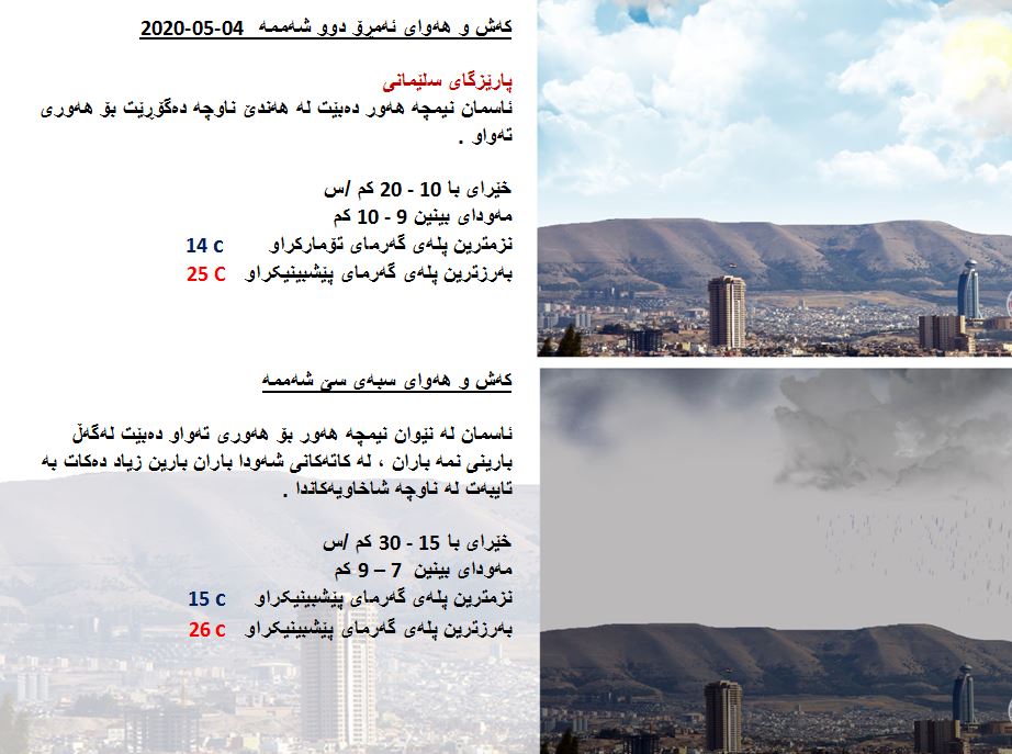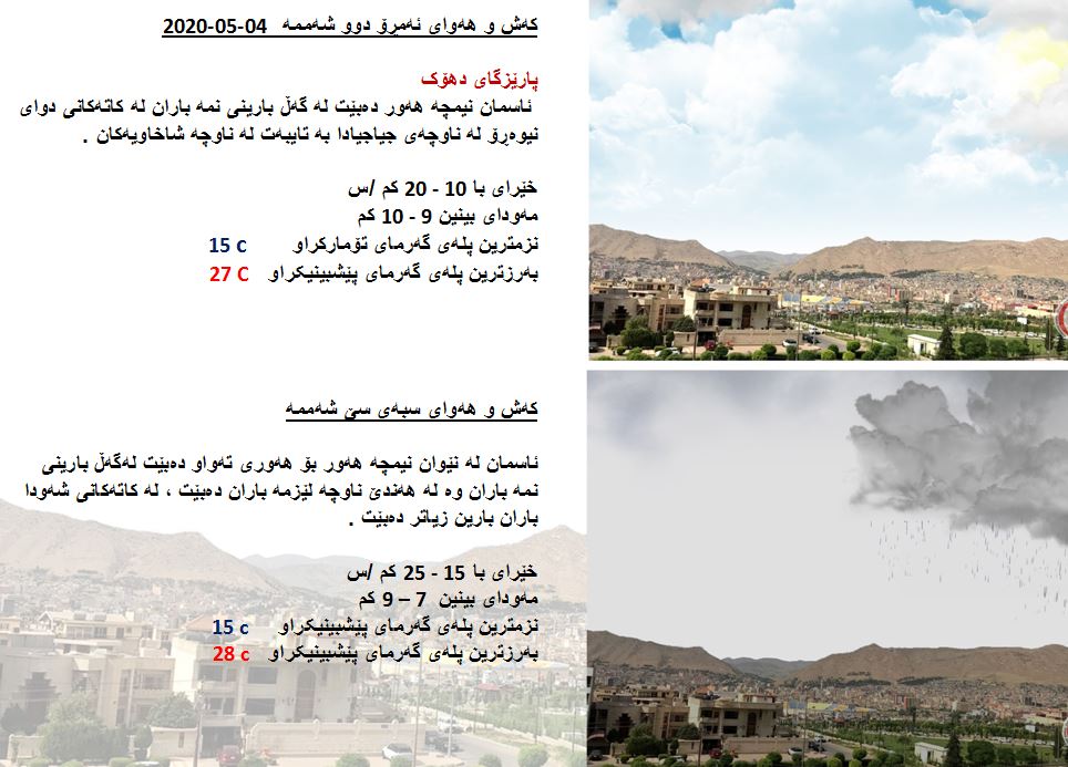 لەبارەی كەشوھەوای سبەی كەشناسی پێشبینی دەكات، رۆژی سێشەممە ئاسمانی ھەرێمی كوردستان لەنێوان نیمچە ھەور و ھەوری تەواودا دەبێت و لە ھەندێك كات و شوێندا نمە باران دەبارێت.