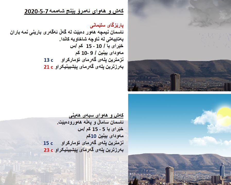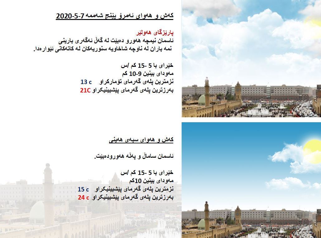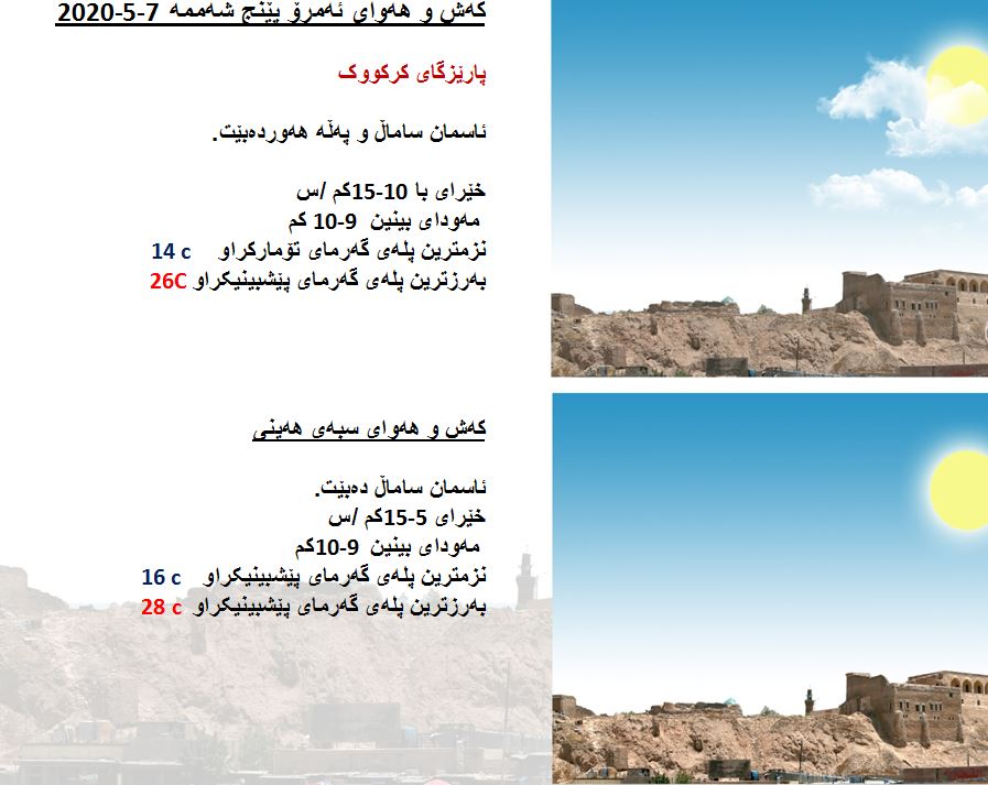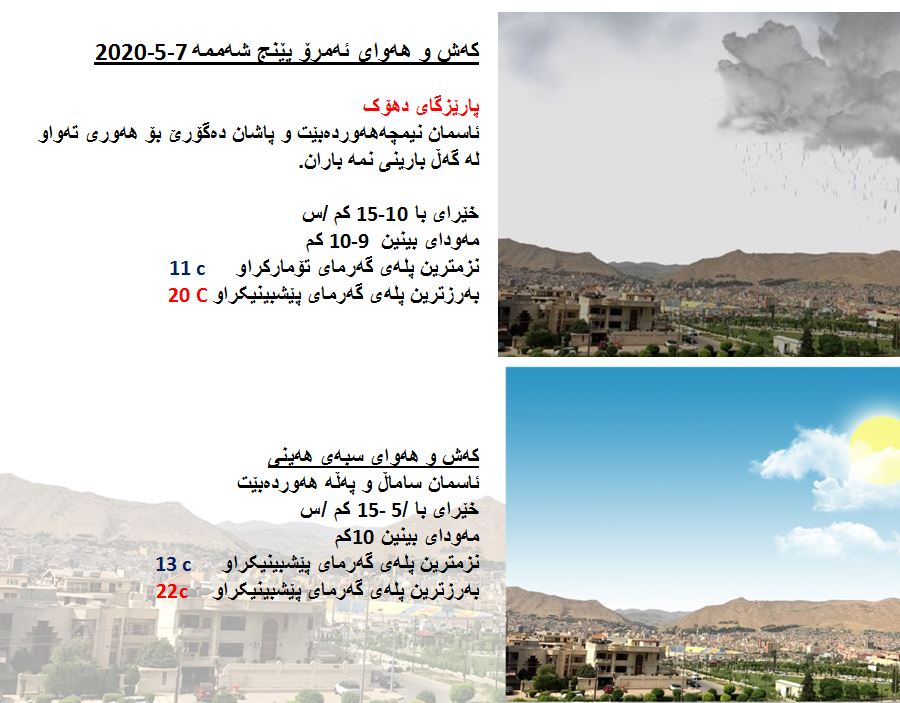 بەڕێوەبەرایەتی كەشناسی و بومەلەرزەزانی ھەرێمی كوردستان، پێشبینیەكانی بۆ كەشوھەوای 48 كاتژمێری داھاتوو راگەیاند، بەگوێرەی پێشبینیەكان ئەمڕۆ ئاسمانی ھەرێمی كوردستان نیمچە ھەور دەبێت لەگەڵ بارینی نمە باران لە ناوچە شاخاوییە سنوورییەكان. بەرزترین پلەی گەرما لە ھەولێر و سلێمانی 21 و دھۆك 20 لە كەركووك بەرزترین پلەی گەرما 26 پلەی سیلیزی دەبێت.