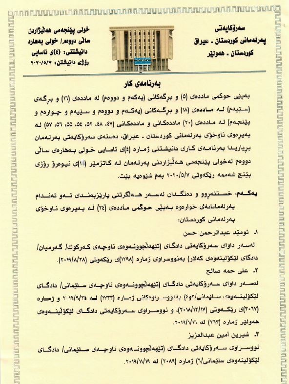 به گوێرهی نووسراوی پهرلهمانی كوردستان، كه واژووی ههریهك له جێگری سهرۆكی پهرلهمان، هێمن ههورامی و سكرتێری پهرلهمان، مونا قاوهچی لهسهره، دانیشتنی ئهمڕۆی پهرلهمان دوو بڕگهی لهخۆی گرتبوو.
