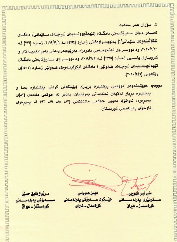 بڕگهی یهكهم ههڵگرتنی پارێزبهندی چوار ئهندام پهرلهمان بوو، ئهوانیش: (ئومێد عهبدولڕهحمان حهسهن، عهلی حهمه ساڵح، شیرین ئهمین عهبدولعهزیز، سۆران عومهر سهعید).
