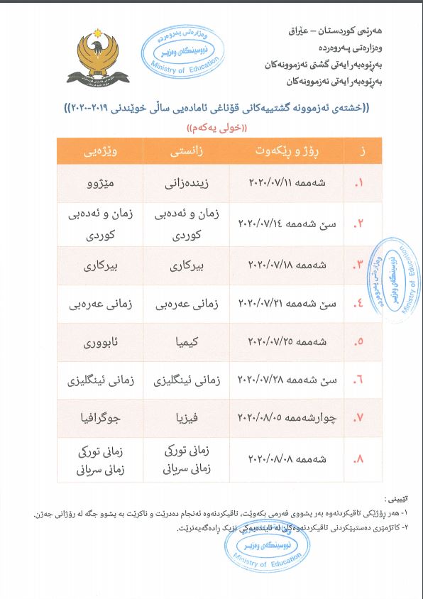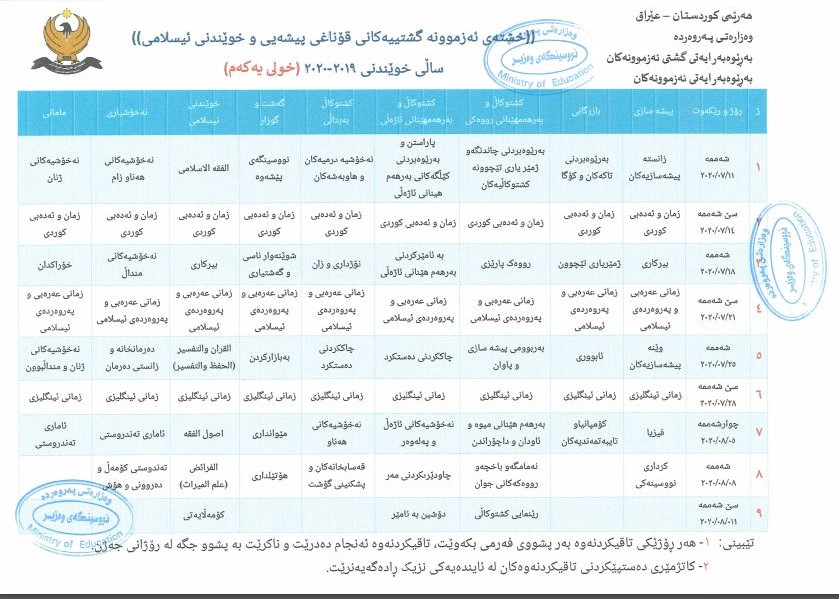 وهزارهتی پهروهردهی حكومهتی ههرێمی كوردستان خشته ئهزموونهكانی قۆناغی 12ی ئامادهیی و خوێندنی ئیسلامی و پیشهیی بڵاوكردهوه.