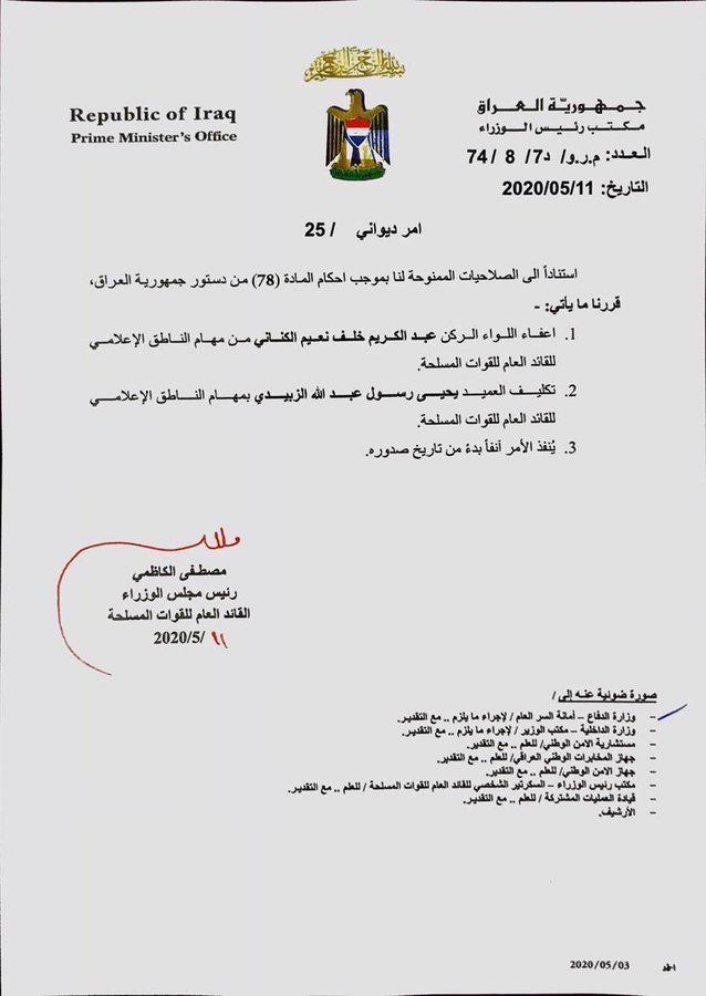 - دوورخستنهوهی لیوا روكن عهبدولكهریم خهڵهف نهعیم ئهلكینانی له ئهركی گوتهبێژی میدیایی فهرماندهی گشتی هێزه چهكدارهكان.