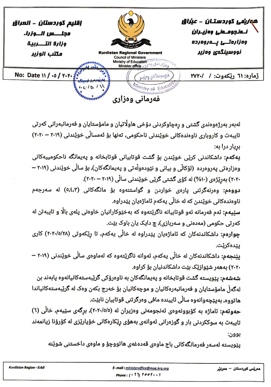 به‌گوێره‌ی فه‌رمانه‌كه‌، كرێی خوێندن بۆ ساڵی خوێندنی "2019-2020" به‌ بڕی 10% داشكاندنی بۆ كراوه‌ و پاره‌ی خواردن و گواستنه‌وه‌ی مانگه‌كانی "1،2،3"ی ئه‌مساڵیش له‌ قوتابیانی ئه‌و خوێندنگایانه‌ وه‌رناگیرێت.