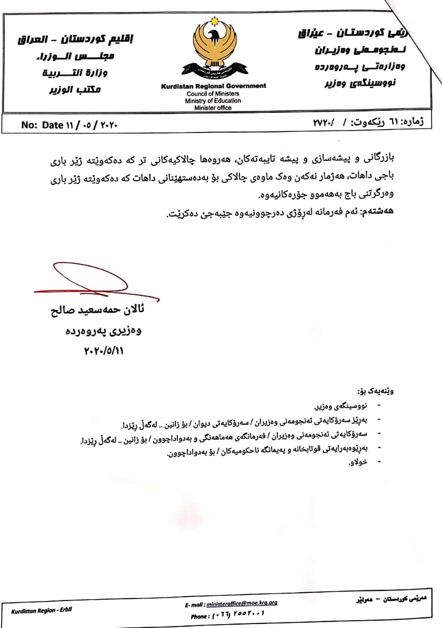 له‌ فه‌رمانێكی وه‌زاره‌یدا، دكتۆر ئاڵان حه‌مه‌ سه‌عید، وه‌زیری په‌روه‌رده‌ی حكومه‌تی هه‌رێمی كوردستان چه‌ند بڕیارێكی له‌باره‌ی كرێی خوێندن بۆ خوێندنی ئه‌مساڵ له‌ قوتابخانه‌، زانكۆ و په‌یمانگه‌‌ ئه‌هلییه‌كان ده‌ركرد.