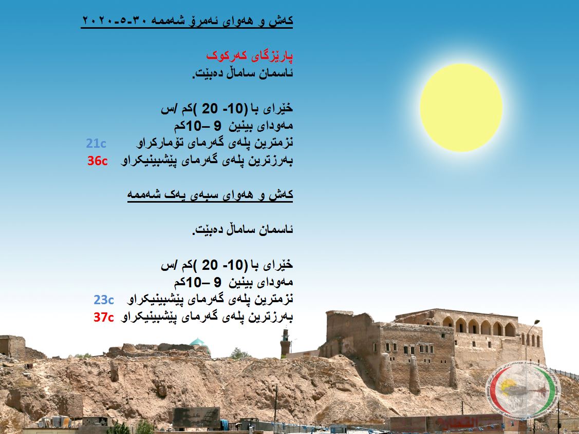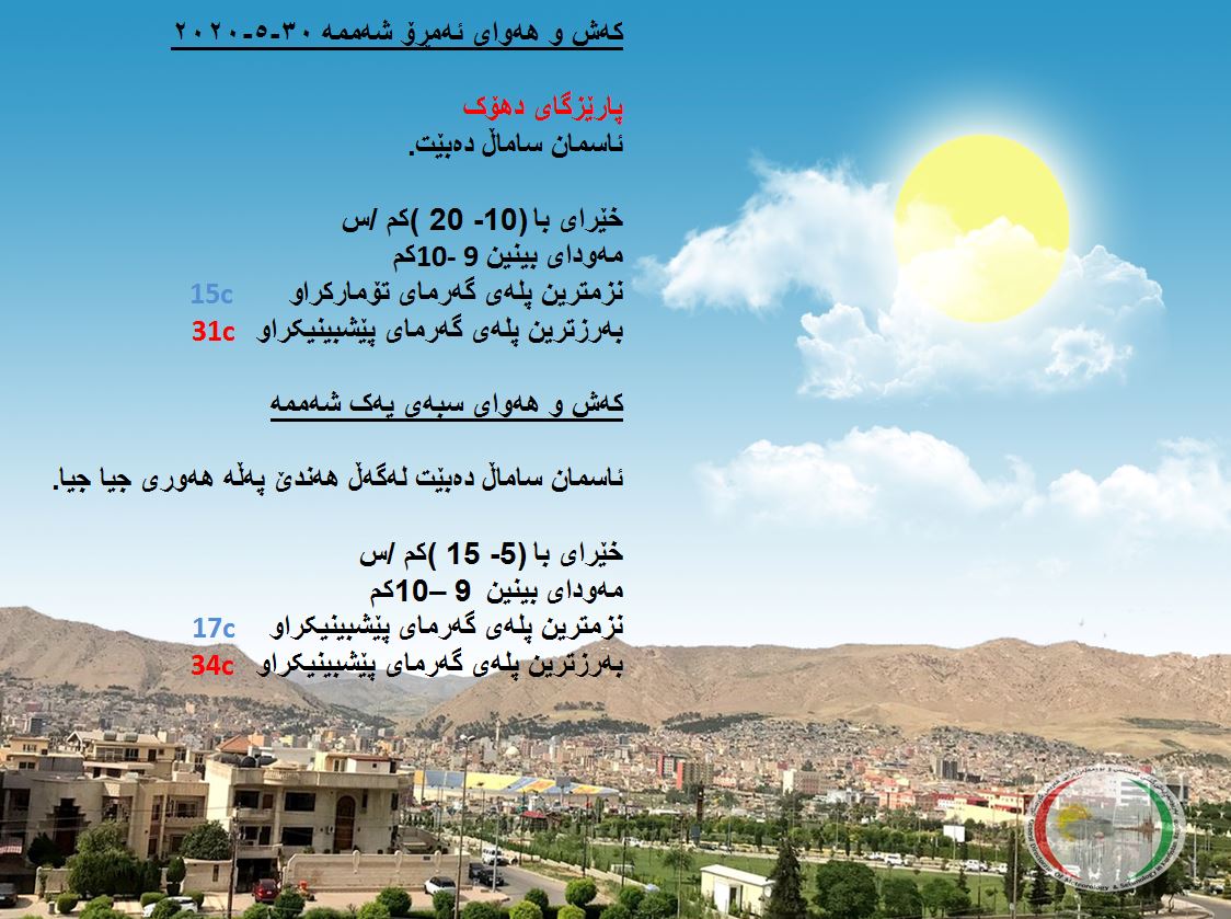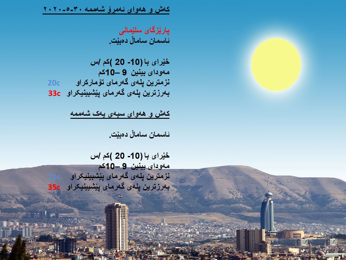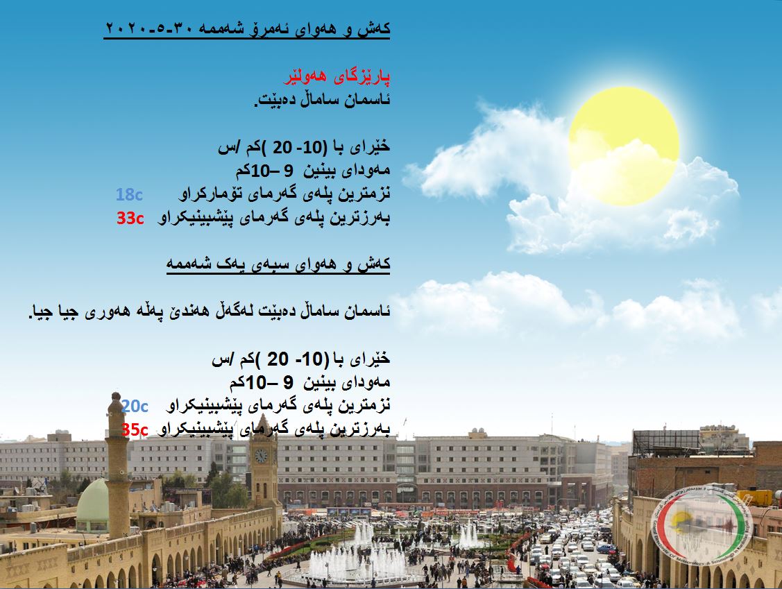 بەڕێوەبەرایەتی كەشناسی و بومەلەرزەزانی ھەرێمی كوردستان، پێشبینیەكانی بۆ كەشوھەوای 48 كاتژمێری داھاتوو راگەیاند، بەگوێرەی پێشبینیەكان ئەمڕۆ ئاسمانی ھەرێمی كوردستان ساماڵ دەبێت. بەرزترین پلەی گەرما لە ھەولێر و سلێمانی 33 و دھۆك 31 لە كەركووك بەرزترین پلەی گەرما 36 پلەی سیلیزی دەبێت.