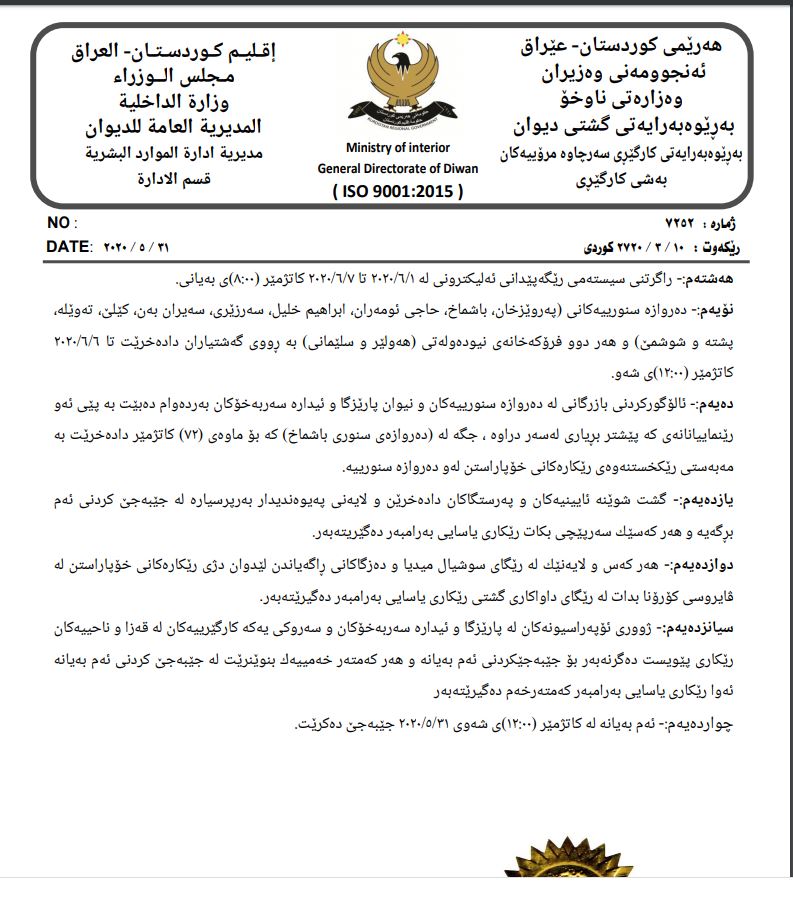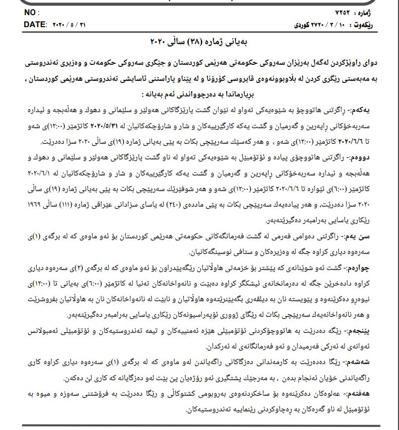 وه‌زاره‌تی ناوخۆی حكومه‌تی هه‌رێمی كوردستان له‌ باره‌ی قه‌ده‌غه‌ی هاتوچۆوه‌ به‌یانێكی ده‌ركرد و بڕیاری قه‌ده‌غه‌ی هاتوچۆی درێژكرده‌وه‌.