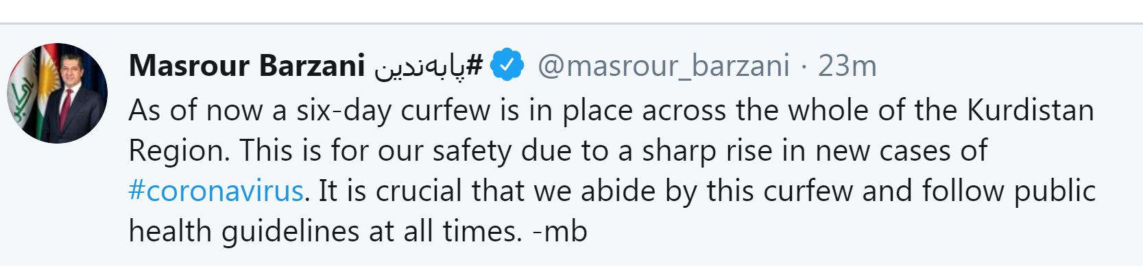 له تویتهكهیدا سهرۆكی حكومهتی ههرێمی كوردستان رایگهیاند، "ئێستا، كه قهدهغهی هاتوچۆ بۆ ماوهی شهش رۆژ له سهرانسهری ههرێمی كوردستان دهچێته واری جێبهجێكردنهوه. ئهم بڕیاره له پێناو پاراستنی تهندروستیمانه، ئهمهش بههۆی زیادبوونی ژمارهی تووشبووانی كۆرۆنا بهشێوهیهكی بهرچاو".