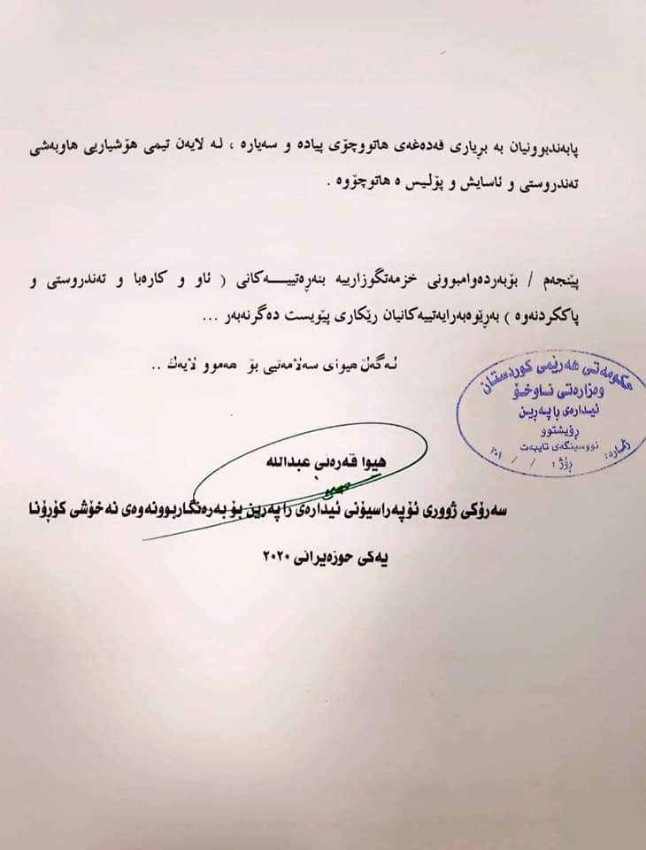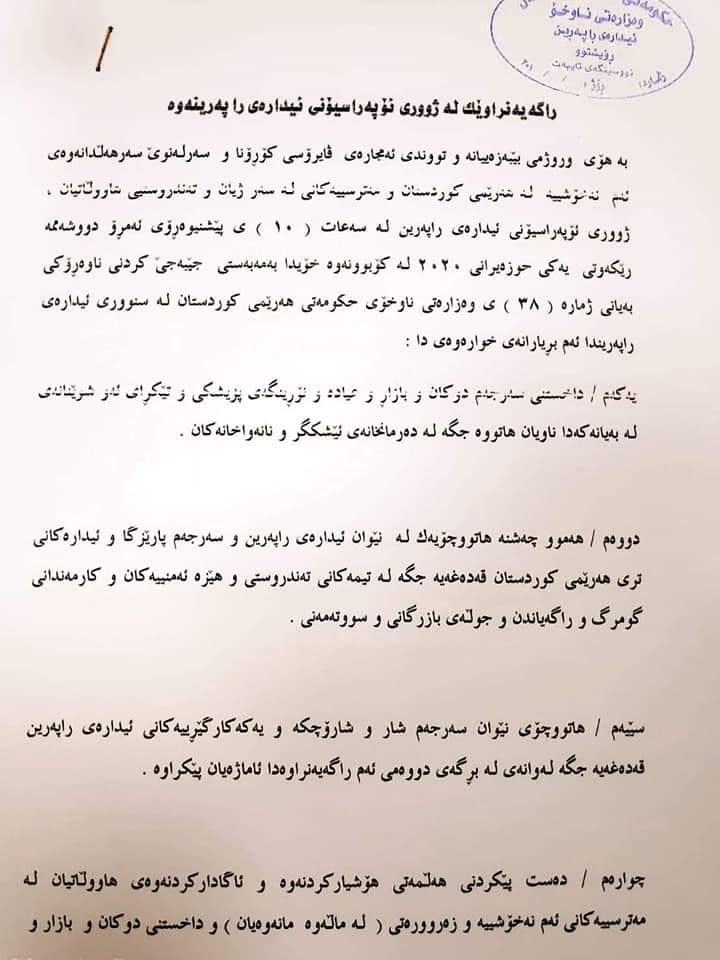 بەگوێرەی نووسراوێکی ژووری ئۆپەراسیۆنی ئیدارەی راپەڕین، تەنها رێگا بە هێزە ئەمنییەکان، کارمەندانی تەندروستی، گومرگ و سووتەمەنی و راگەیاندنکاران دەدرێت هاتووچۆ بکەن.