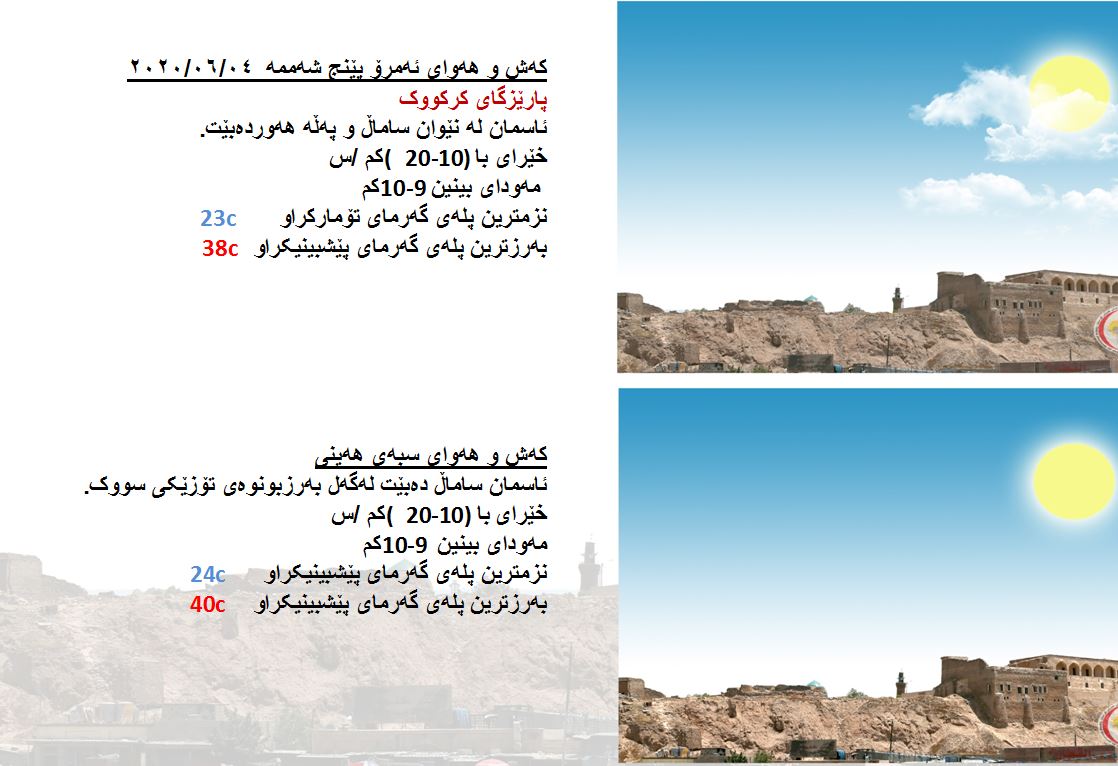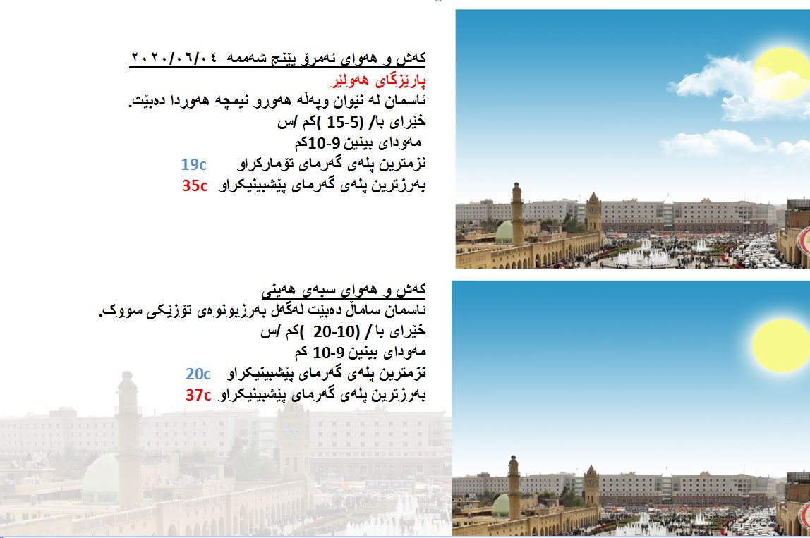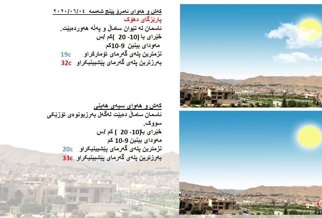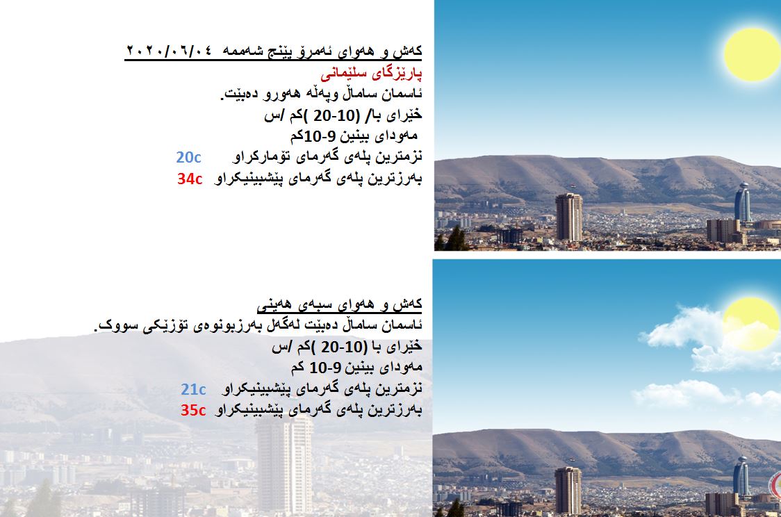بەڕێوەبەرایەتی كەشناسی و بومەلەرزەزانی ھەرێمی كوردستان، پێشبینیەكانی بۆ كەشوھەوای 48 كاتژمێری داھاتوو راگەیاند، بەگوێرەی پێشبینیەكان ئەمڕۆ ئاسمانی ھەرێمی كوردستان لەنێوان پەڵە ھەور و نیمچە ھەوردا دەبێت. بەرزترین پلەی گەرما لە ھەولێر 35 و سلێمانی 34 و دھۆك 32 لە كەركووك بەرزترین پلەی گەرما 38 پلەی سیلیزی دەبێت.